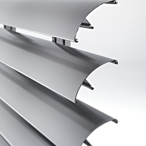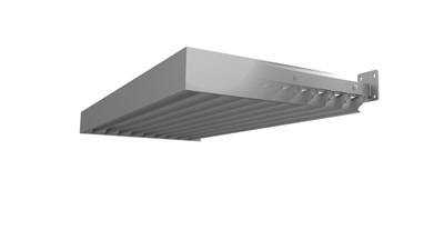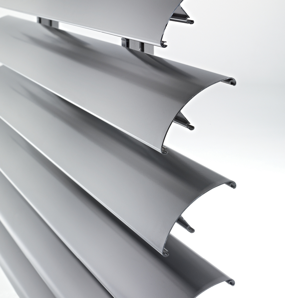 Permanent external solar shading system. 100 D Series solar shading systems have their aluminium blades below the support profiles at a fixed 45 degree blade mounting angle. All fascia profiles are available in a wide range of finishes. Overhang-dependent, the systems are fixed to the façade not just with bracketry, but also with struts.