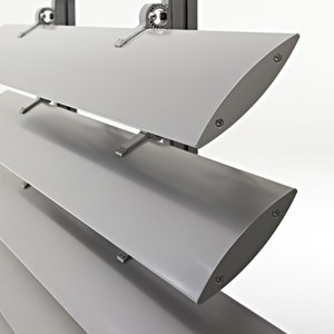 This solar shading system is available with either fixed or electrically adjustable blades. They are installed to the support system on-site (either horizontally or vertically). This system allows for a wide variety of blade mounting angles. This ensures that the system can shade the area optimally regardless of the glazed surface and the position of the sun throughout the day.