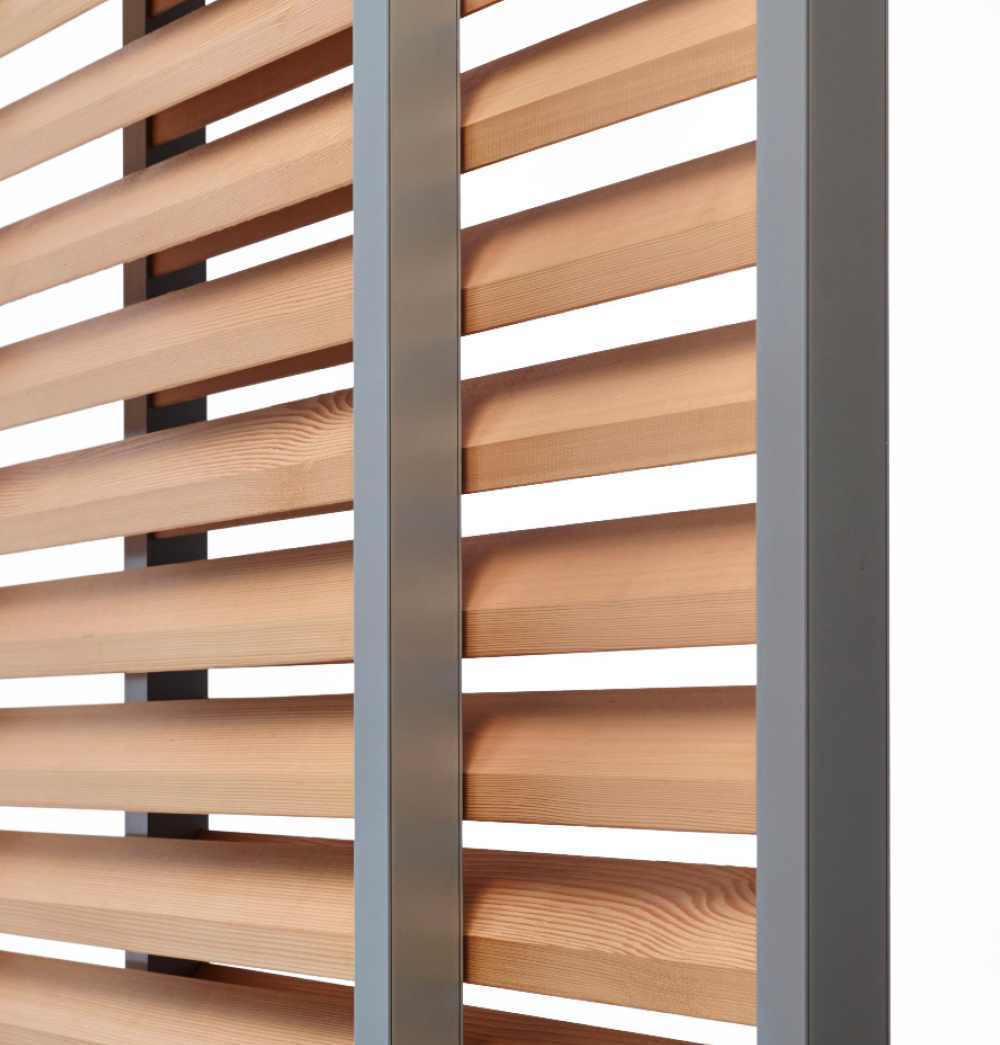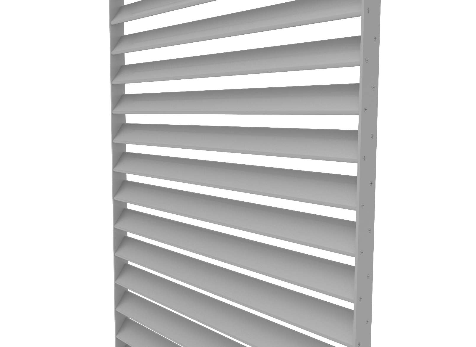 The DucoSlide SlimFrame series consists of sliding shutters that have their blades held between discreet SlimFrame type lateral guide rails at a fixed inclination angle.