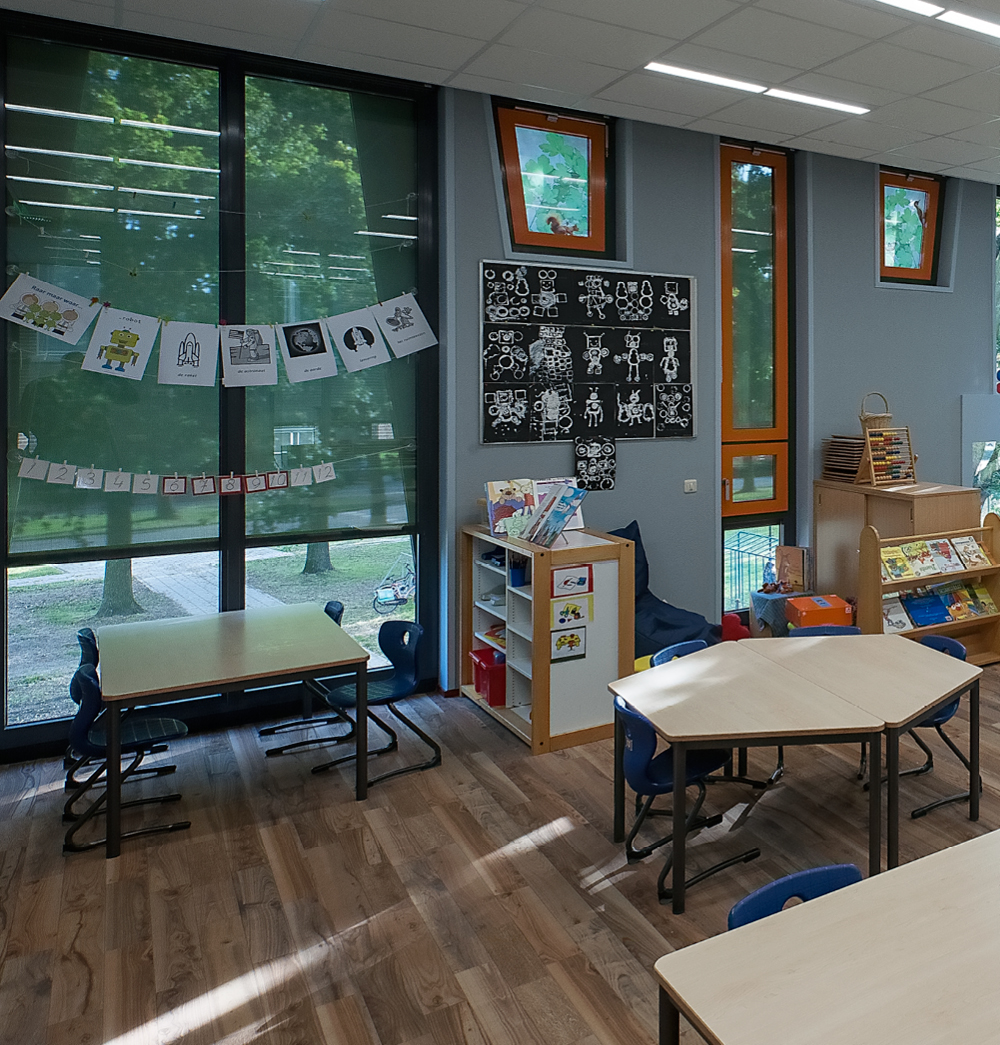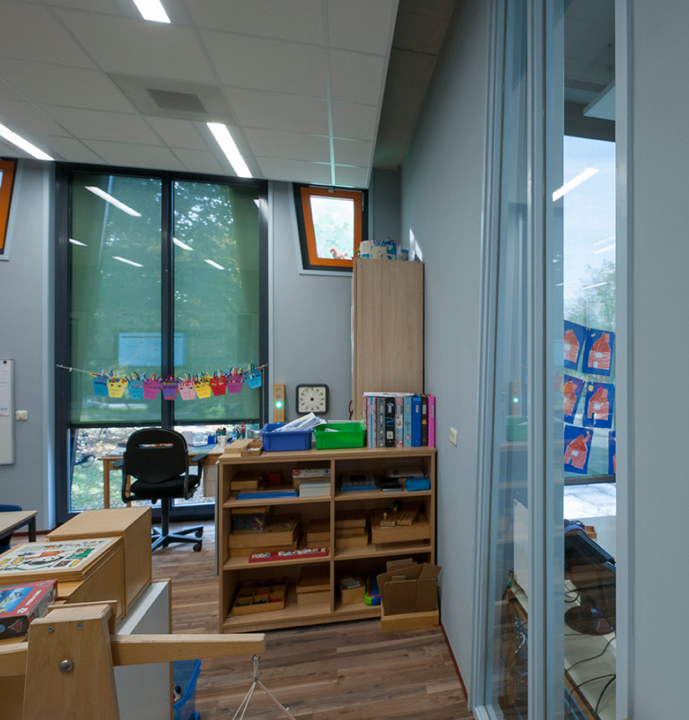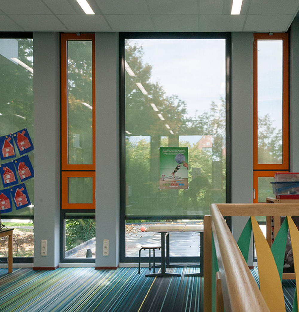In consultation with the architects, DUCO got to work with the DucoTwin 120 'ZR' and the TronicTwin 120 5 Pa, two window ventilators with integrated solar shading, to keep the indoor climate in the primary school controllable. "Thanks to the use of these two window ventilators, there was more than just a natural supply of fresh air," says the architect. "Both ventilators also guarantee the optimum balance of sufficient daylight, preserving the outside view and affording efficient protection from the sun's rays. In addition, they ensure adequate ventilation even when the solar shading system was closed. Ease of installation and maintenance from inside are two major added benefits."