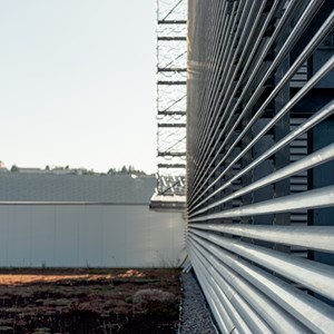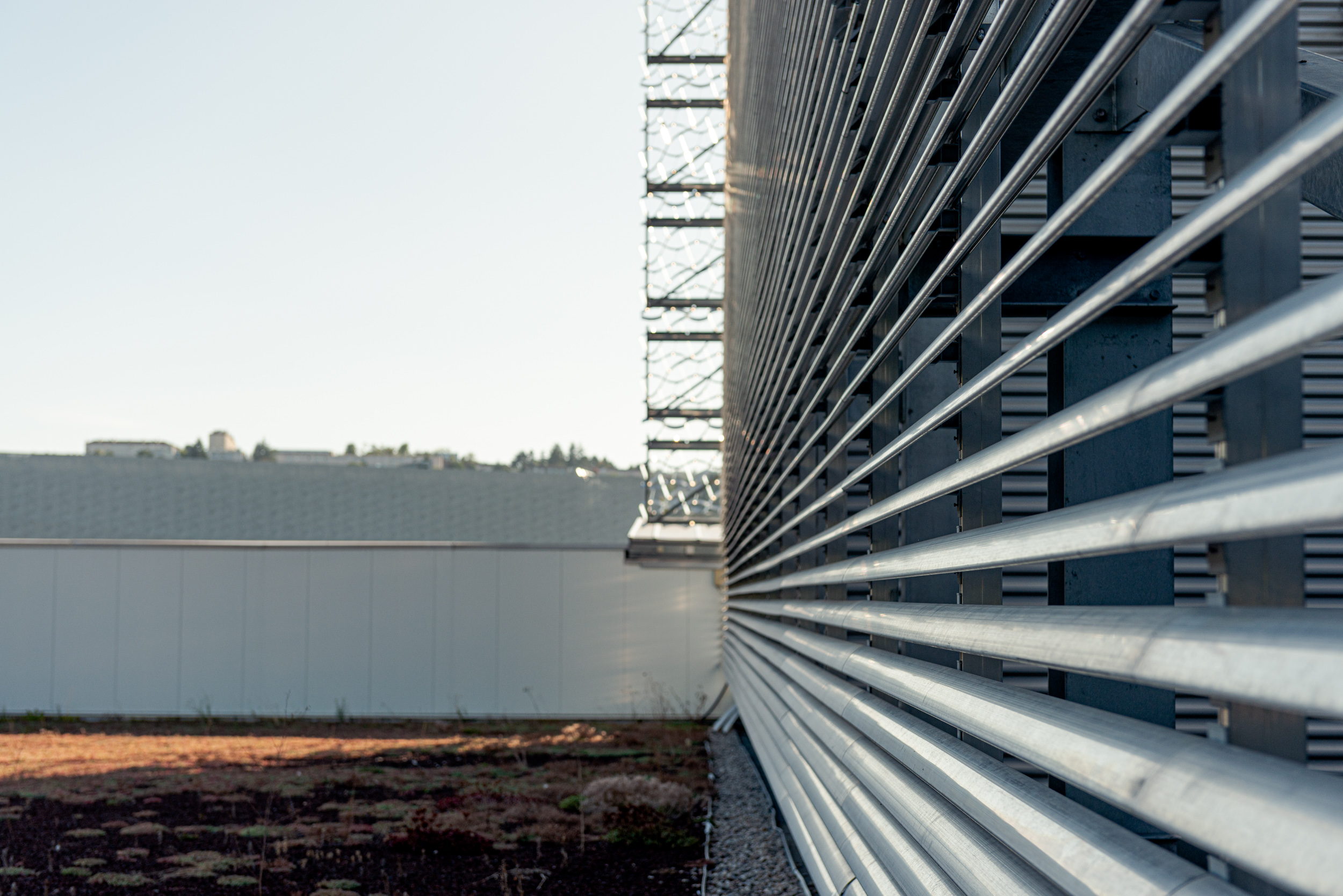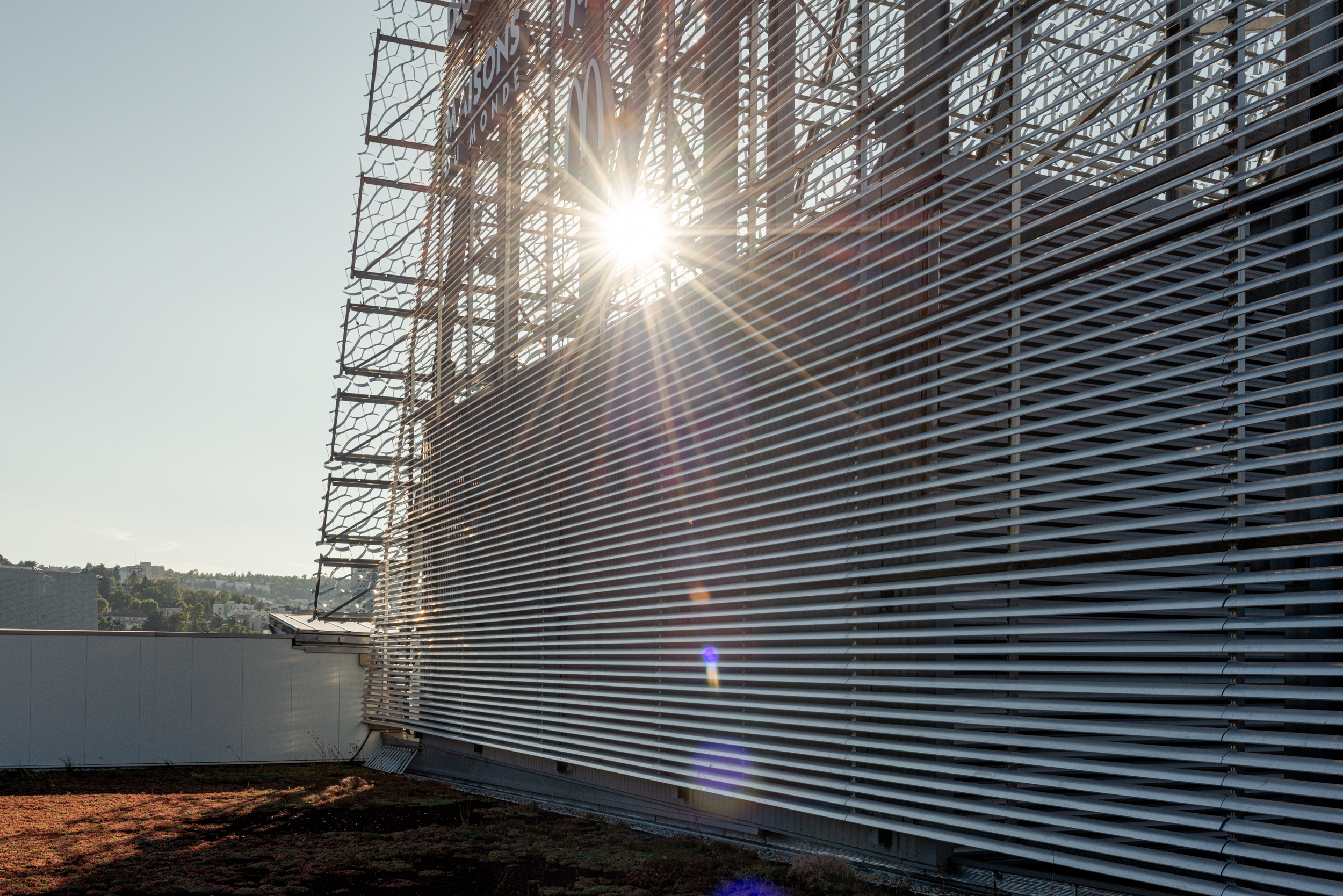 This system offers an ideal privacy screening solution that meets the aesthetic requirements of the project whilst ensuring exceptional technical performance. The continuous louvre wall creates a play of horizontal lines that amplifies the visual effect of the metallic mesh imagined by Joran Briand, whilst guaranteeing optimal natural ventilation and effective solar protection.