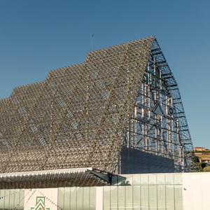 The architecture of Pavillon STEEL is distinguished by its spectacular roof that dialogues with the lines of the Saint-Étienne landscape, directing perspectives towards the city centre. But it is above all its envelope that captivates: the façades are clad with a metallic and luminous mesh, specially created by designer Joran Briand, giving the building a unique and recognisable identity.