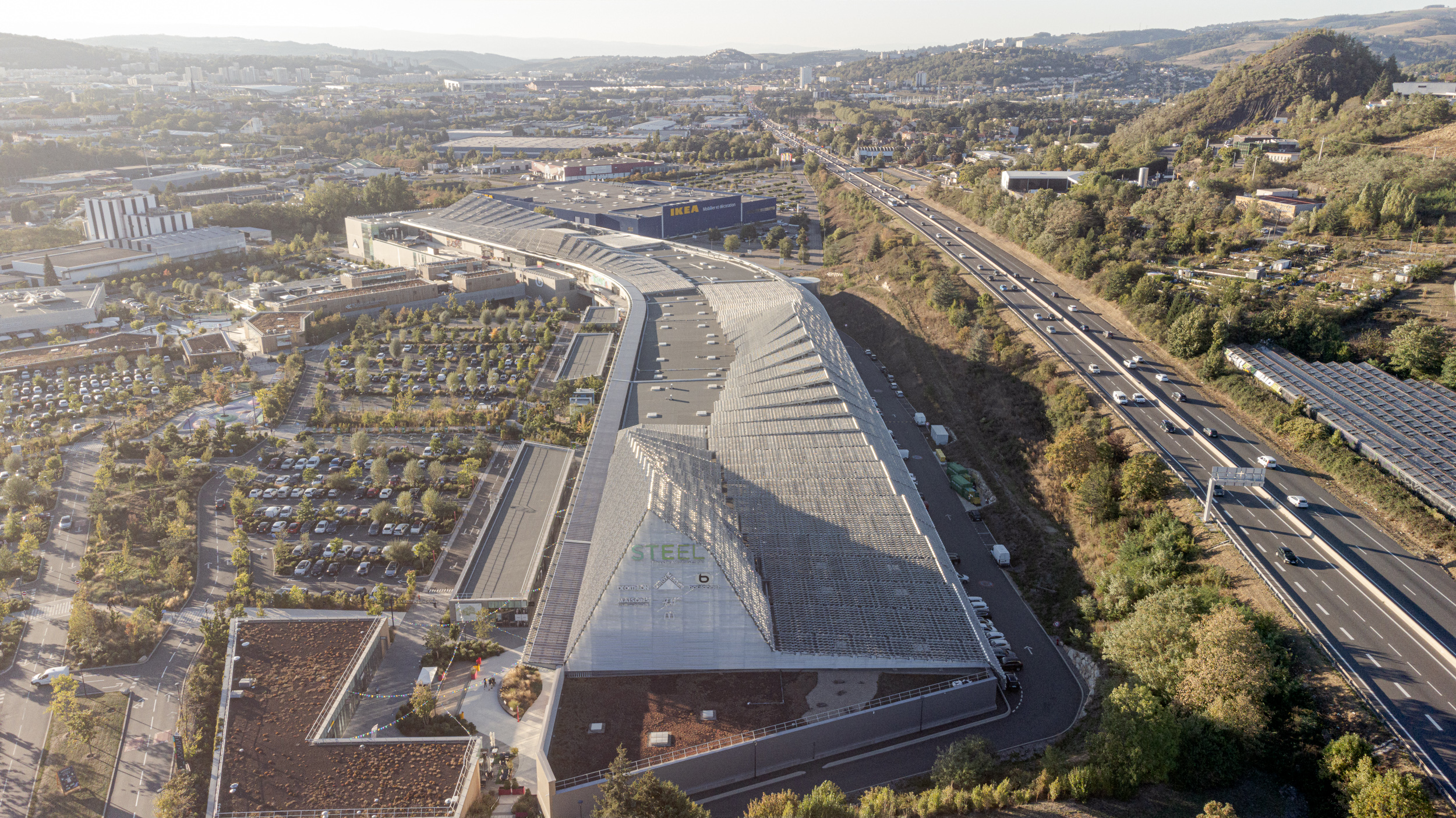 Located at the main entrance to Saint-Étienne, along the A72 motorway, STEEL stands as a spectacular contemporary architectural landmark. With its 70,000 m² of retail and leisure spaces, this project redefines the retail experience whilst creating a genuine urban park that integrates biodiversity and nature.