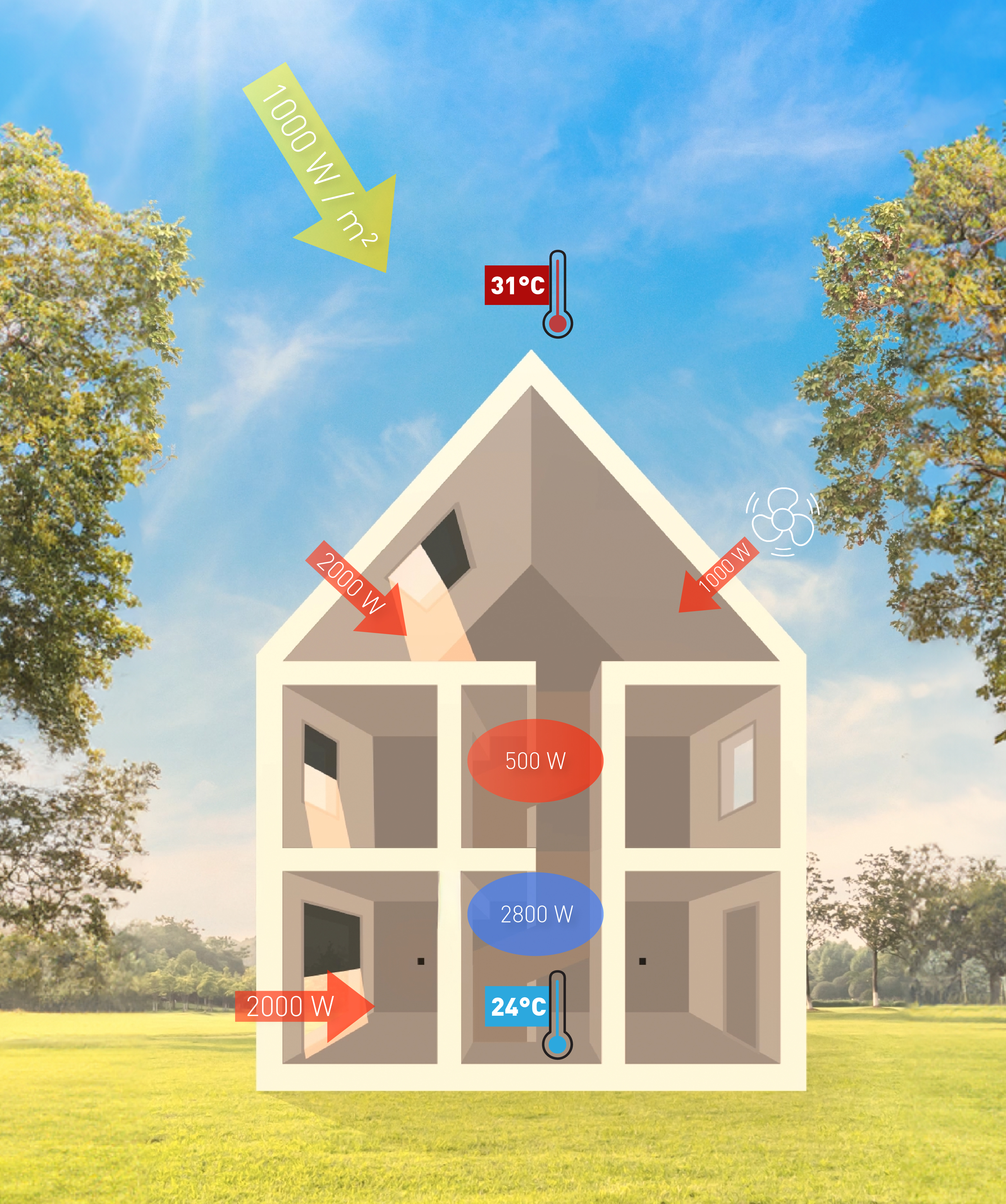 Pour maintenir l'habitation à 24°C, il faut éliminer 2,8 kW de chaleur – c'est ce qu'on appelle la charge de refroidissement. La chaleur pénètre dans l'habitation par :