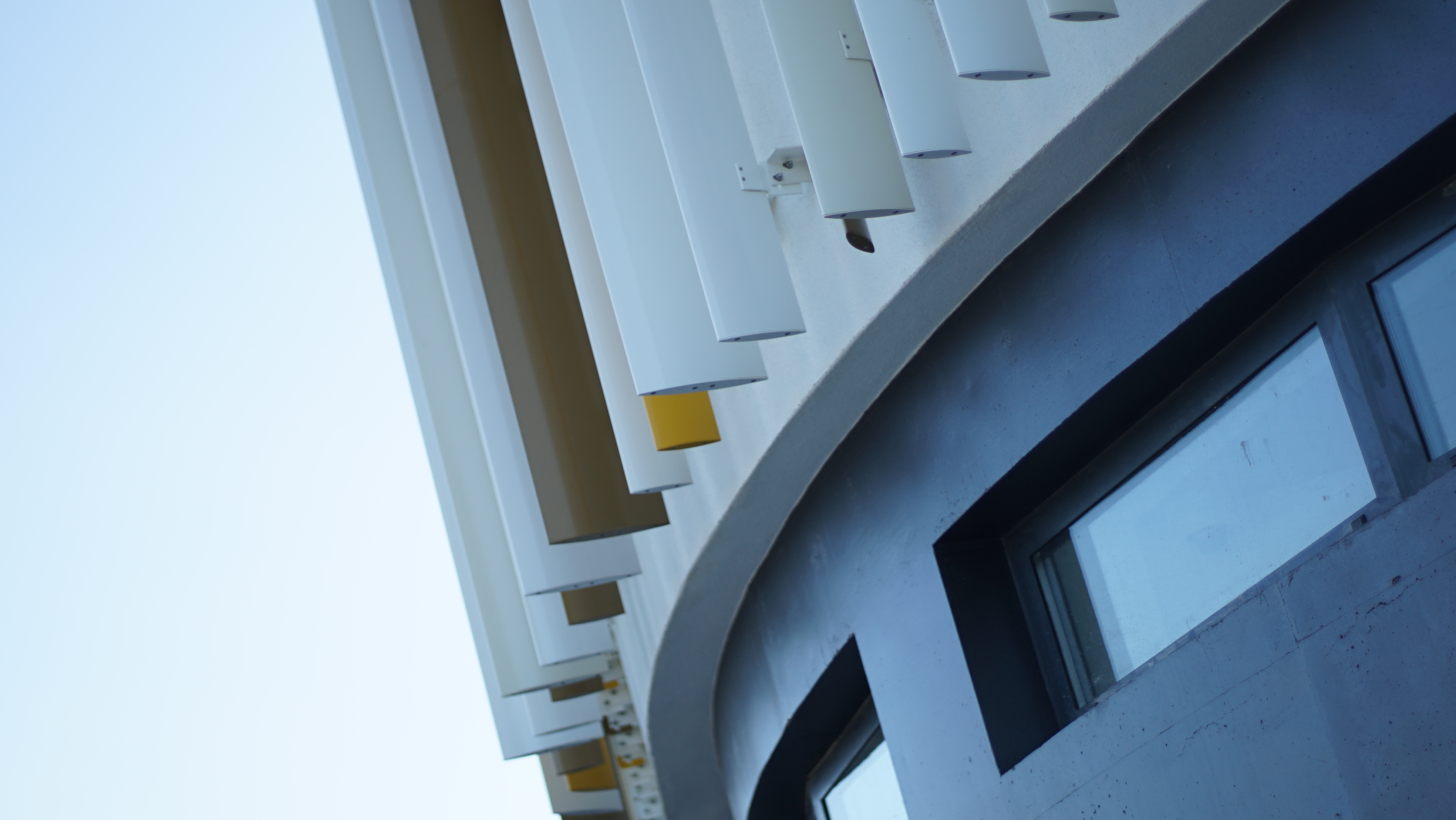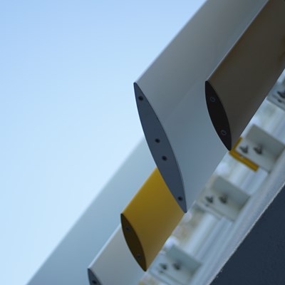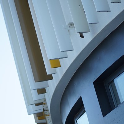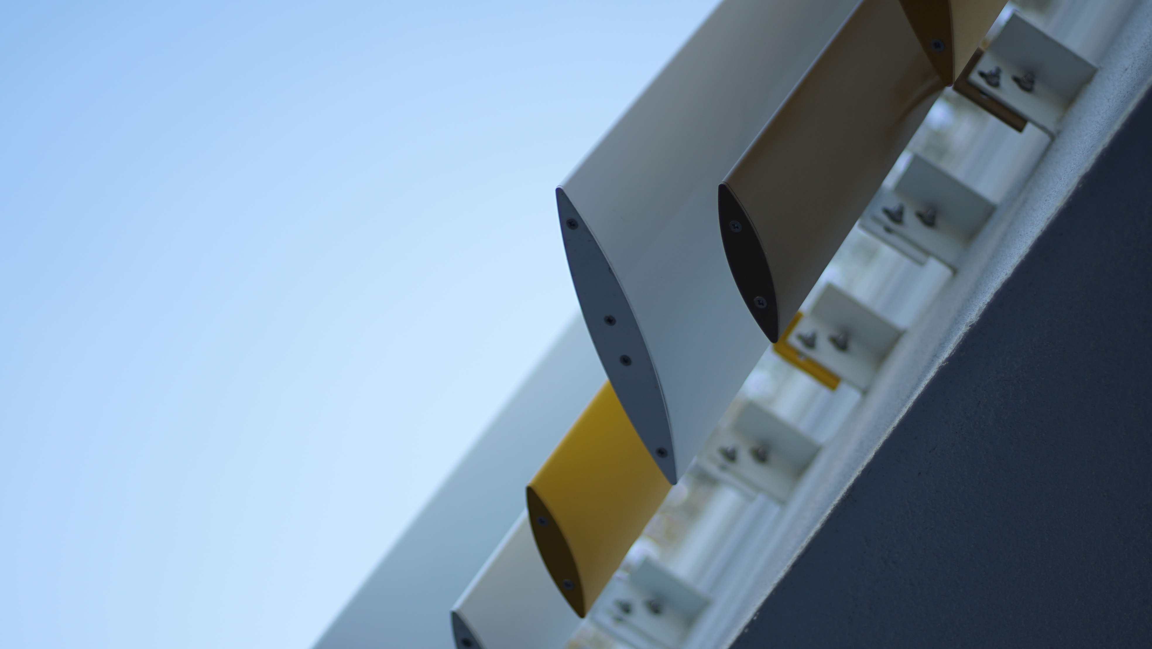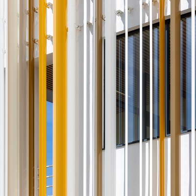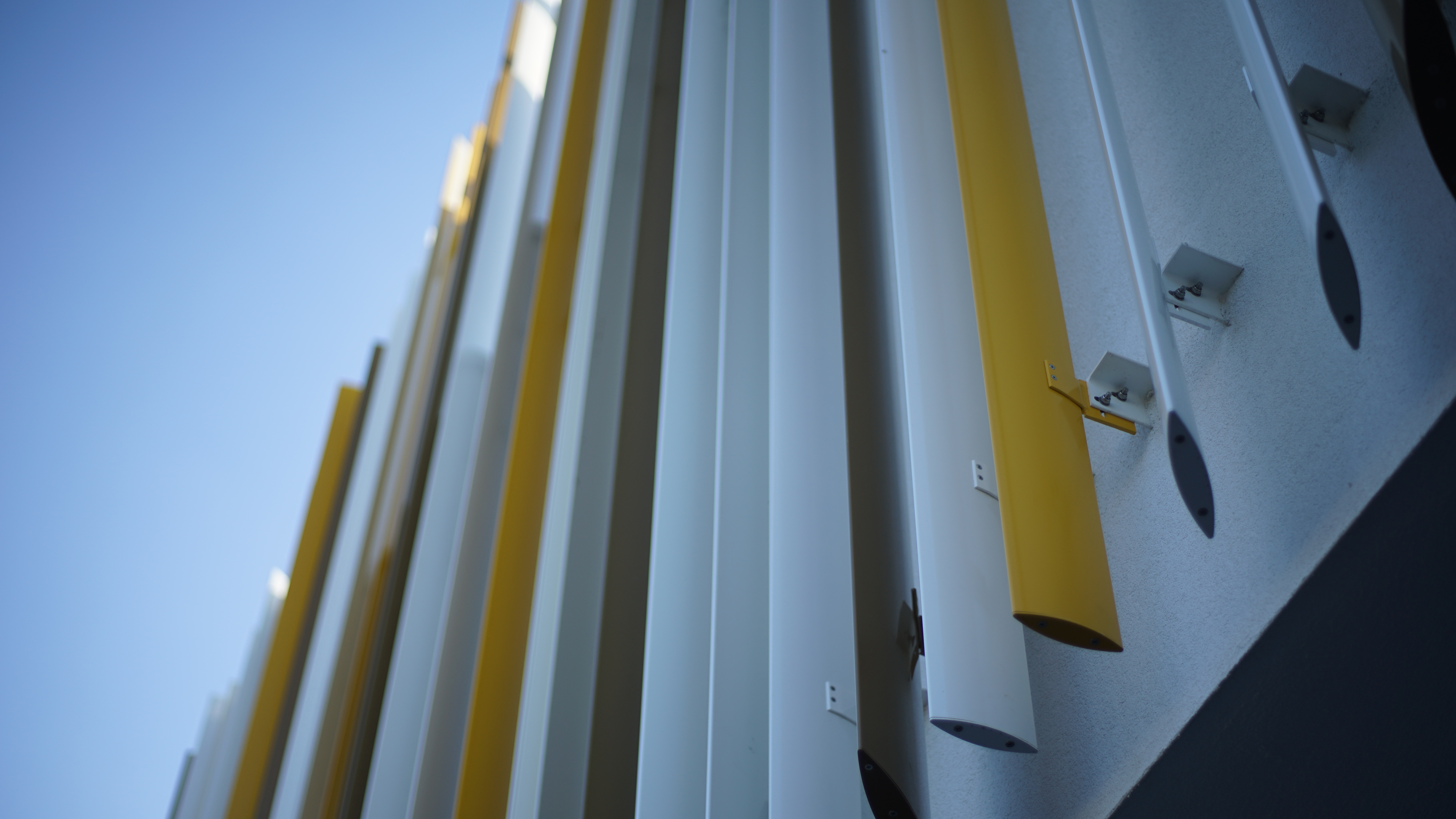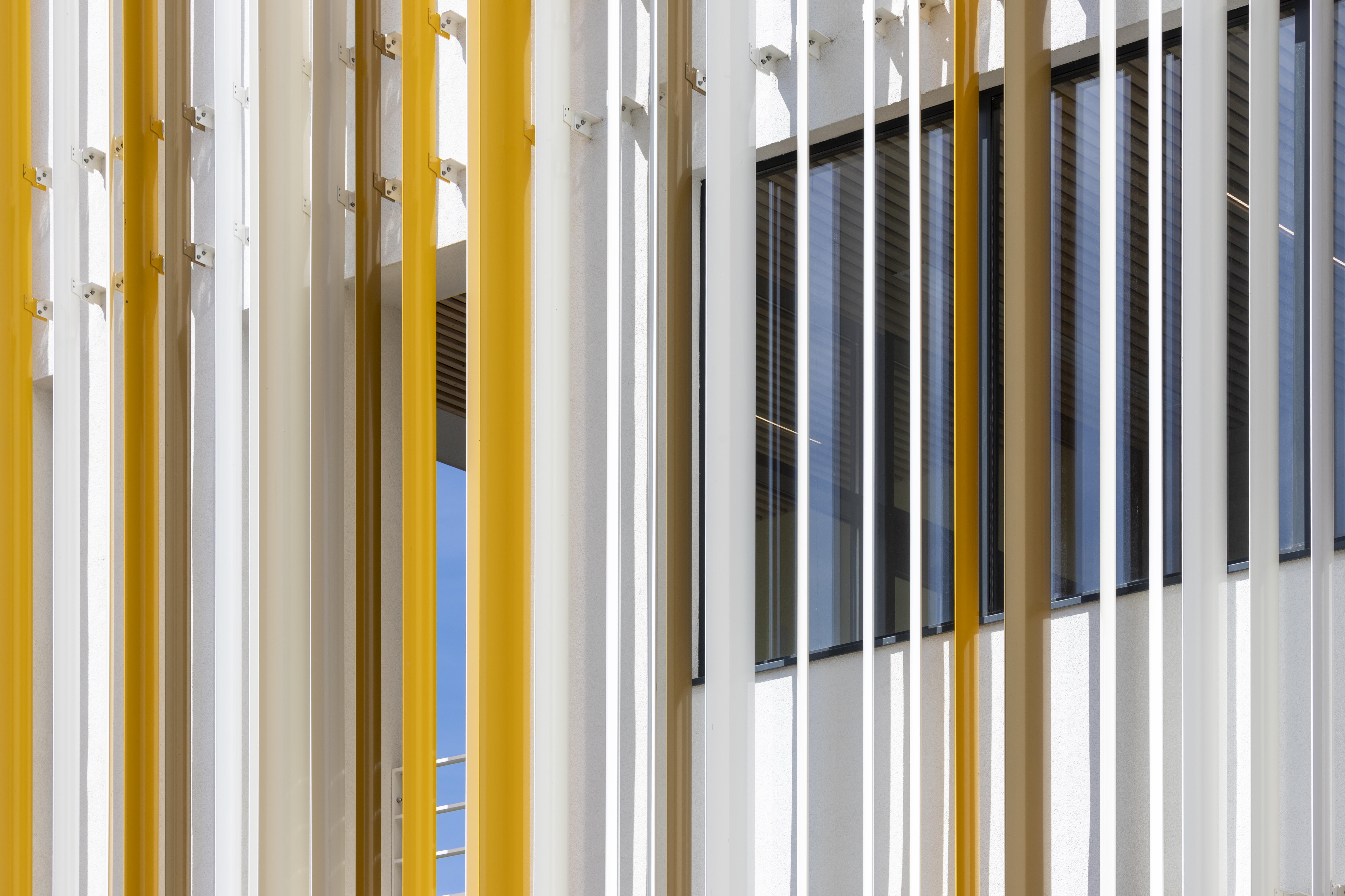 Les brise-soleil architecturaux ont été montés sur un système d’accroche spécifique derrière l’ITE projeté. En plus, afin de pouvoir accéder aux ouvrants pompiers à tout moment, une structure indépendante des brise-soleil a été prévue. L’ alternance des couleurs des lamelles en combinaison avec le rythme et l’orientation variable des lames, donnent un caractère ludique et moderne à l'ensemble. Les différentes tailles de 150, 200 et 300 mm de largeur des lames contribuent également au caractère unique de la façade.