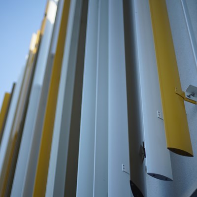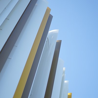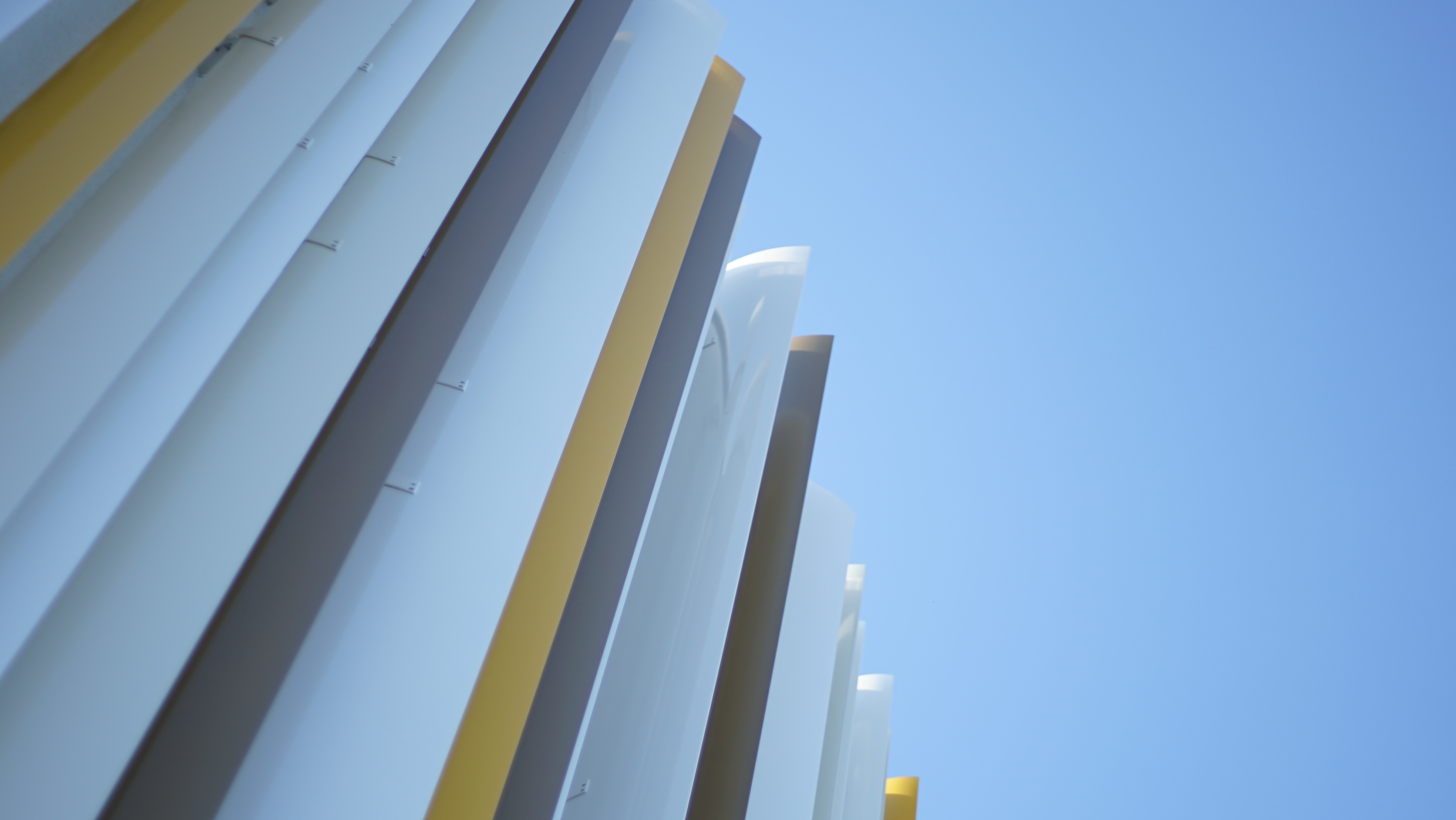 Lames de caractère et colorées recouvrant la façade du centre aquatique Osmose