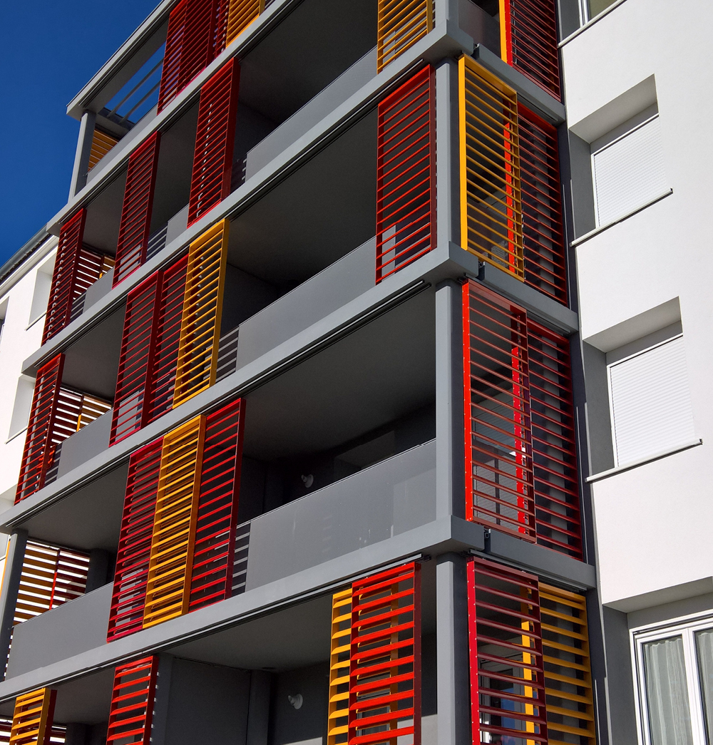 L’objectif fixé par Atlantic Aménagement au cabinet rochelais ABP Architectes était d’améliorer le confort du bâtiment, notamment en permettant une moindre consommation des logements, mais aussi en créant des balcons sur cette résidence de 40 logements. Ces balcons rapportés en béton ont été agrémentés de volets coulissants DucoSlide, afin de tempérer les ardeurs du soleil d’été. En effet, la façade est bien exposée, plein Sud. Cela permet de profiter des apports solaires gratuits d’hiver, et de se protéger derrière les panneaux coulissants de DUCO en été. Une logique que les meilleurs cabinets d’architecture adoptent régulièrement.