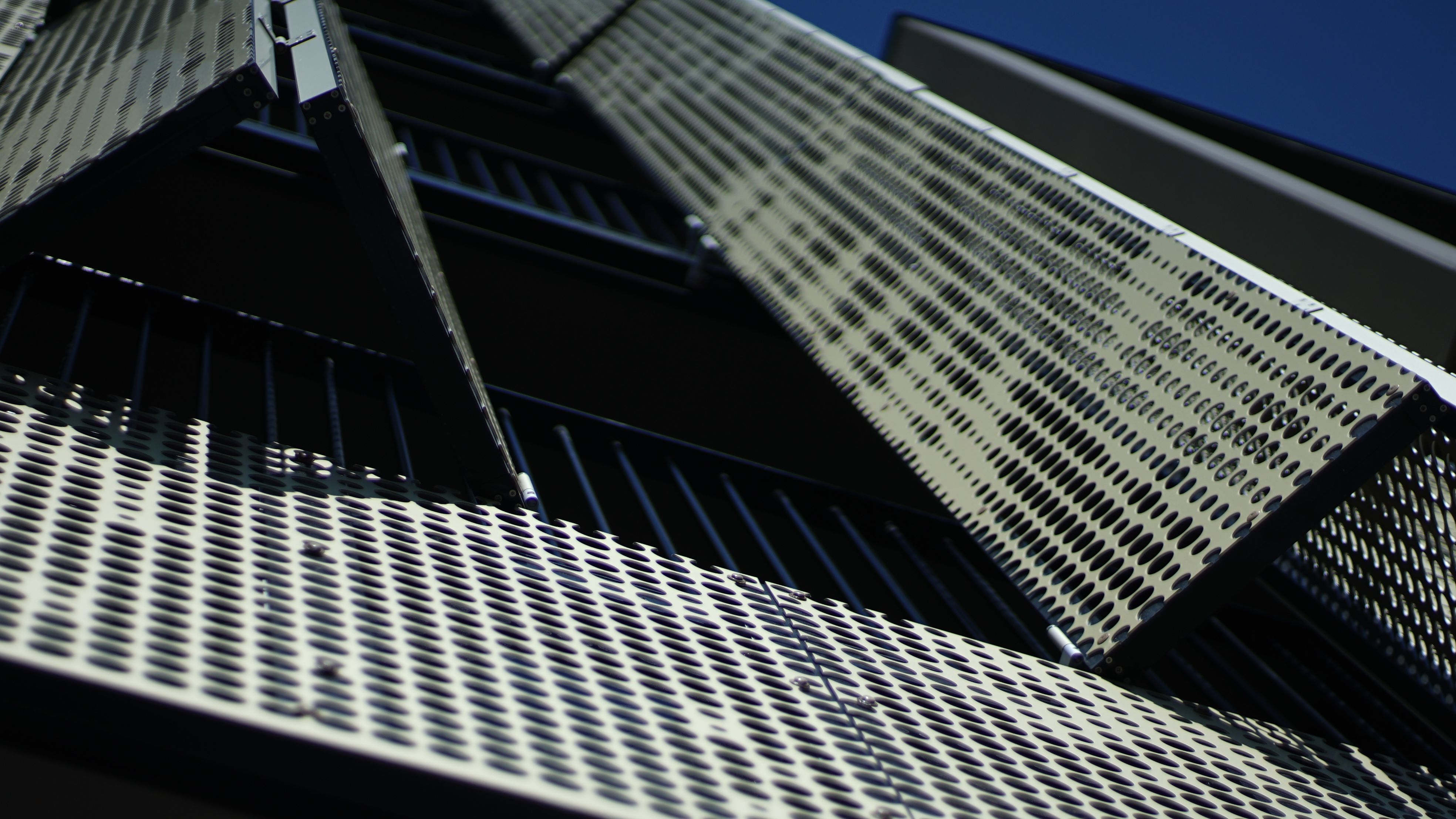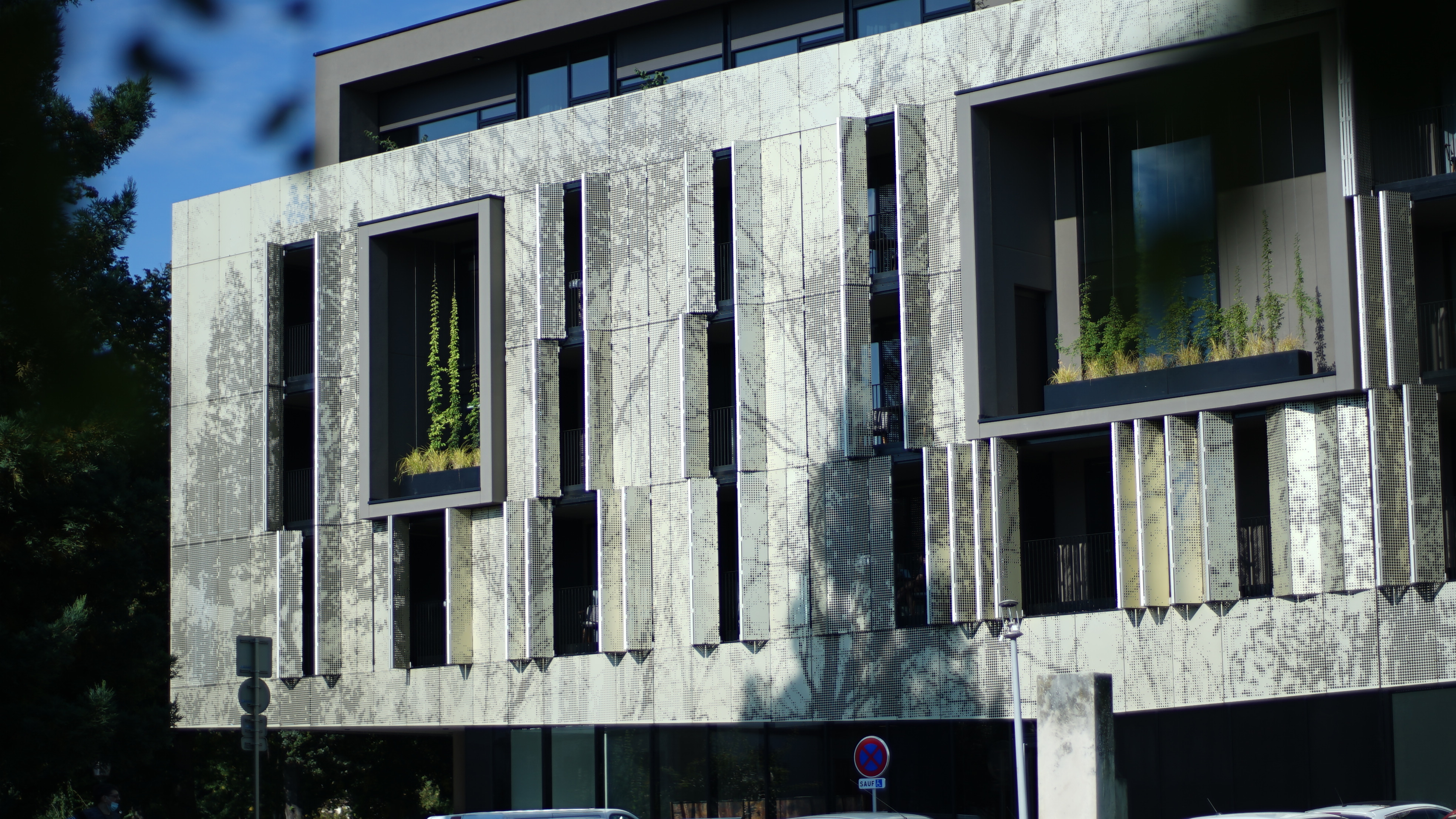 Sur ce projet  ont été installés de grands volets repliants DucoSlide QuadraFold d’environ 3 m de hauteur, installés en nez de dalle pour créer une peau complète extérieure de façade. La quincaillerie du système DucoSlide BiFold et QuadraFold est très robuste, pour pouvoir garantir un fonctionnement parfait même avec de grandes dimensions. Sur le projet, le rail haut du mécanisme est situé dans l’encombrement de la dalle, ainsi que le rail bas de guidage du volet de l’étage supérieur. De ce fait, les parties mobiles, s’alignent parfaitement avec la hauteur du balcon de dalle à dalle. Un vrai travail de précision, mais le rendu est superbe !