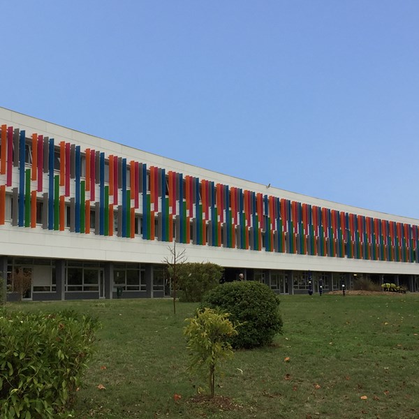 La protection solaire architecturale multicolore est l'accroche-regard du Lycée Jean-Monnet à Yzeure.