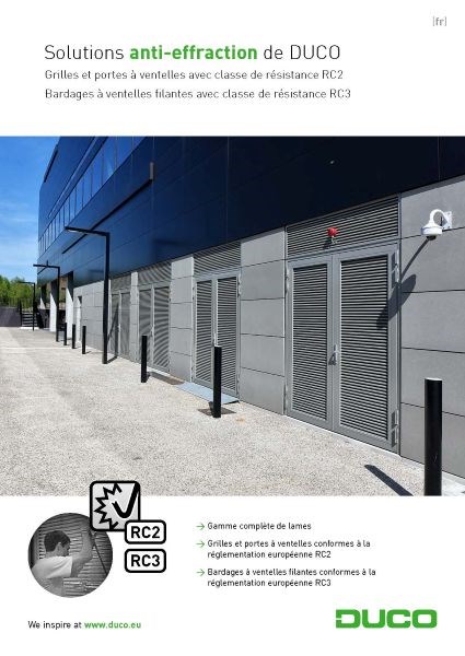 DUCO propose dans sa gamme de grilles plusieurs solutions innovantes qui répondent à la classe de résistance RC2 selon les normes européennes. Les portes à ventelles anti-effraction sont également disponibles jusqu'à la classe de résistance RC2. Grâce à un système breveté, les systèmes de bardage à ventelles filantes atteignent même la classe de résistance RC3. Ainsi, DUCO propose de nombreuses solutions anti-effraction qui conviennent parfaitement à une ventilation nocturne / ventilation d'évacuation.