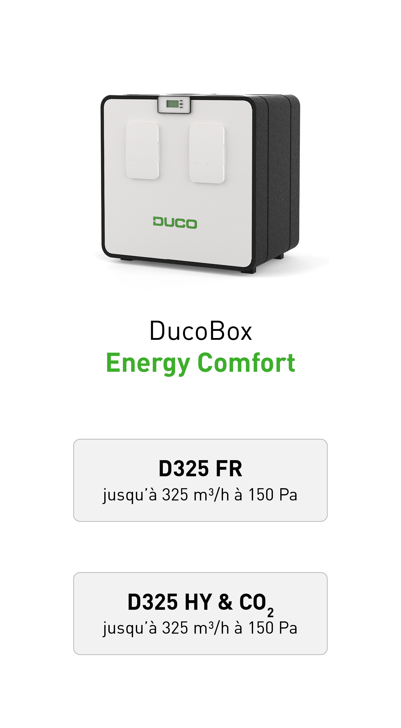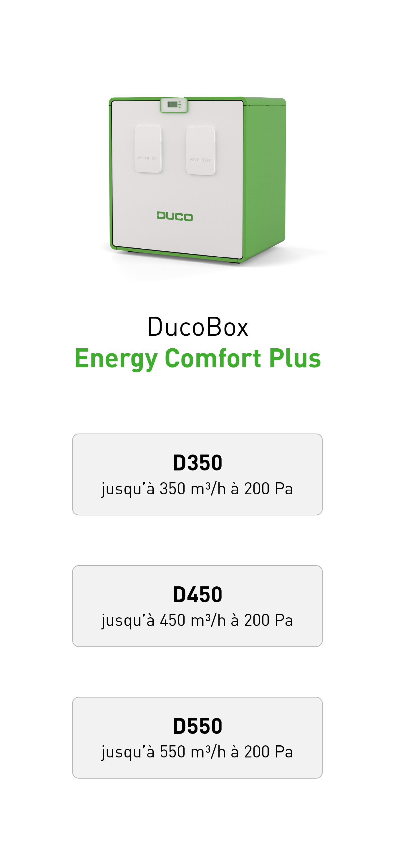 Le système DucoBox Energy Comfort (Plus) a été développé pour une utilisation en ventilation équilibrée avec récupération de chaleur. Ce système de ventilation intelligent et silencieux, avec ses différentes versions et sa capacité réglable jusqu'à 550 m3/h, est la solution pour chaque situation dans la construction résidentielle.