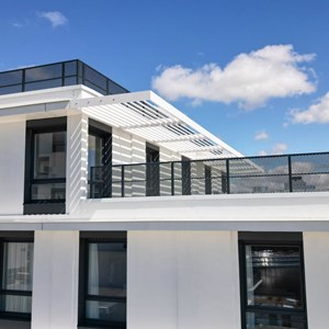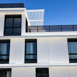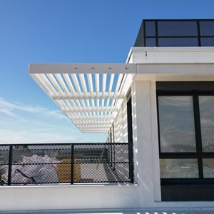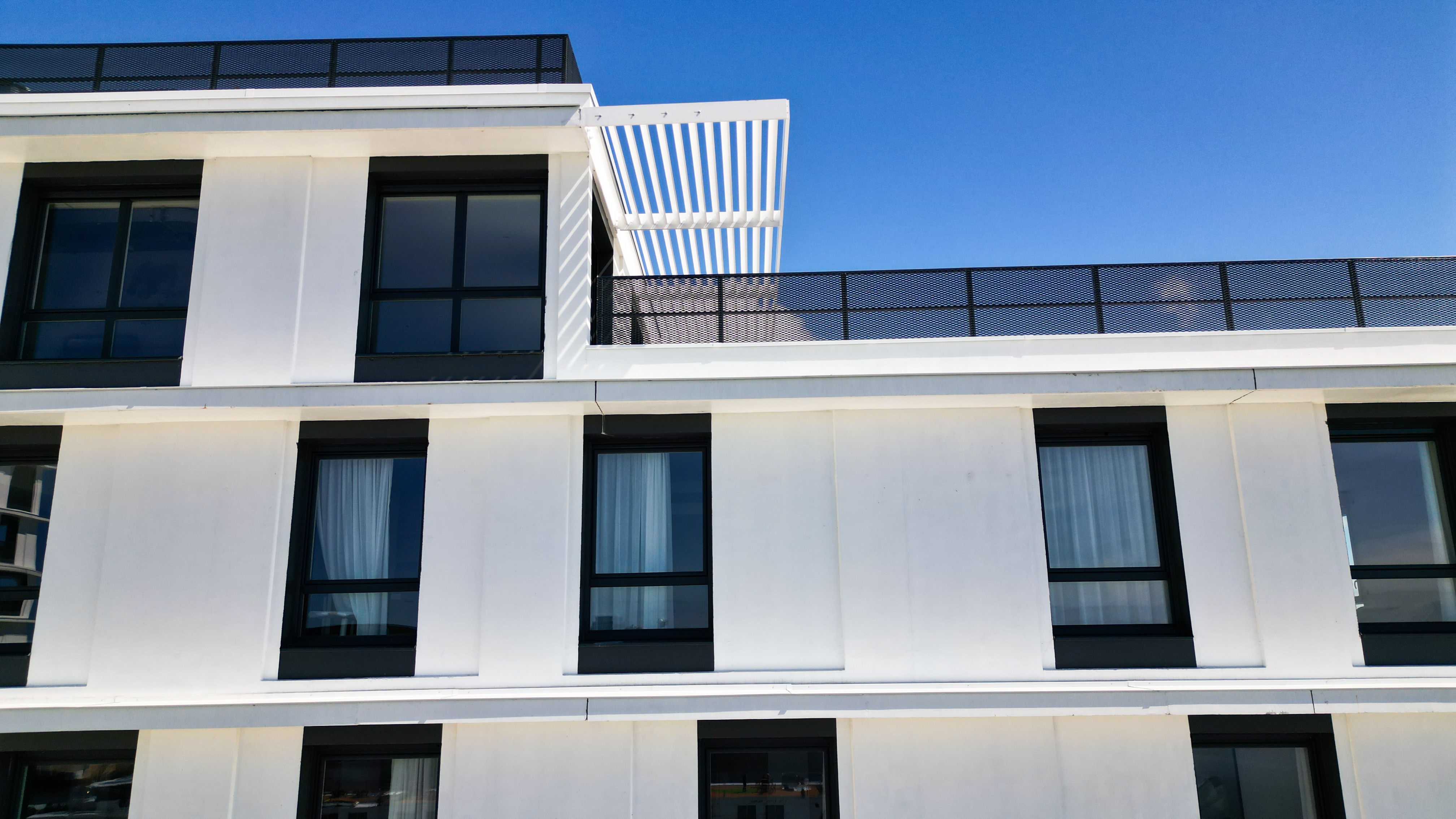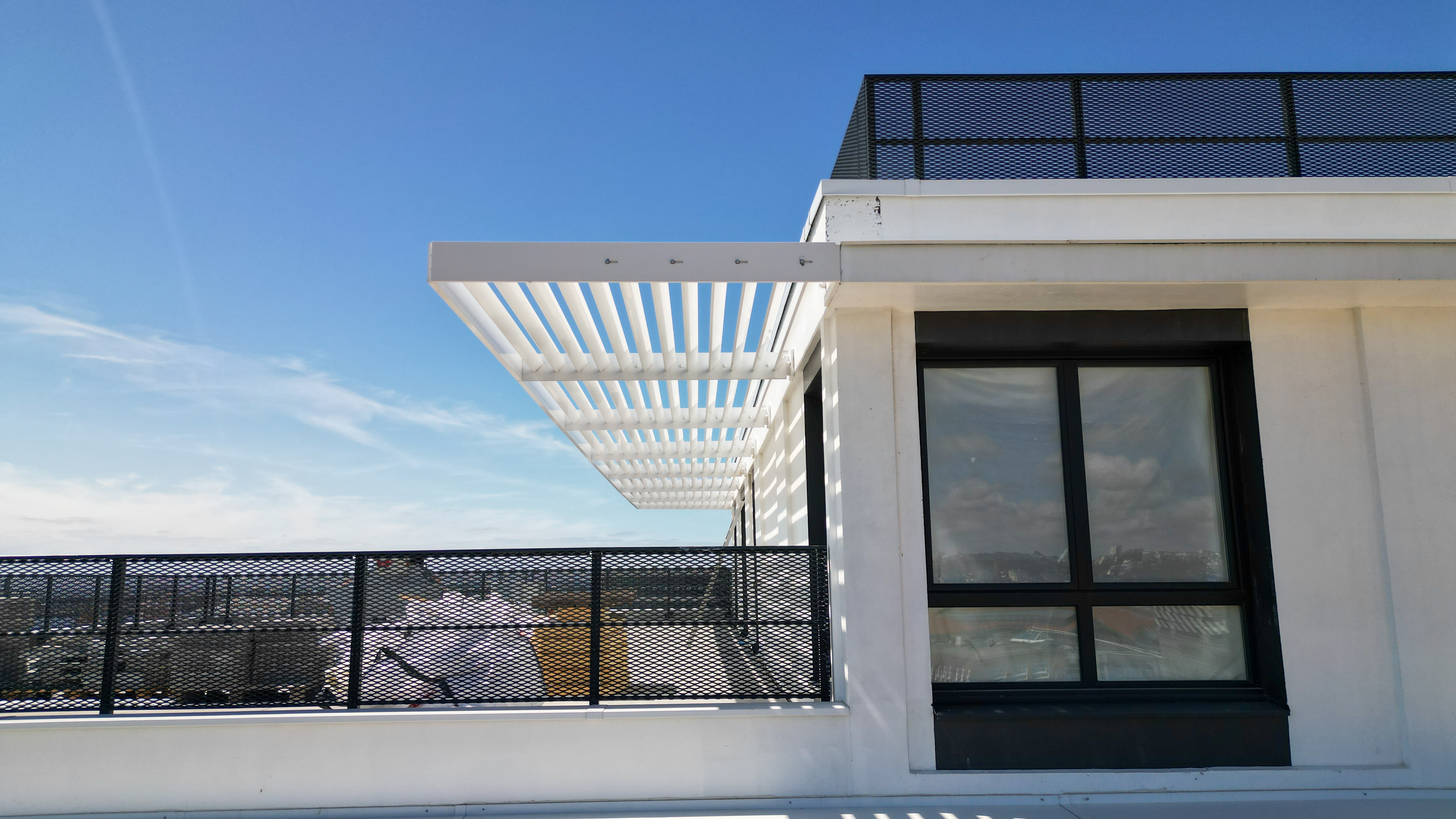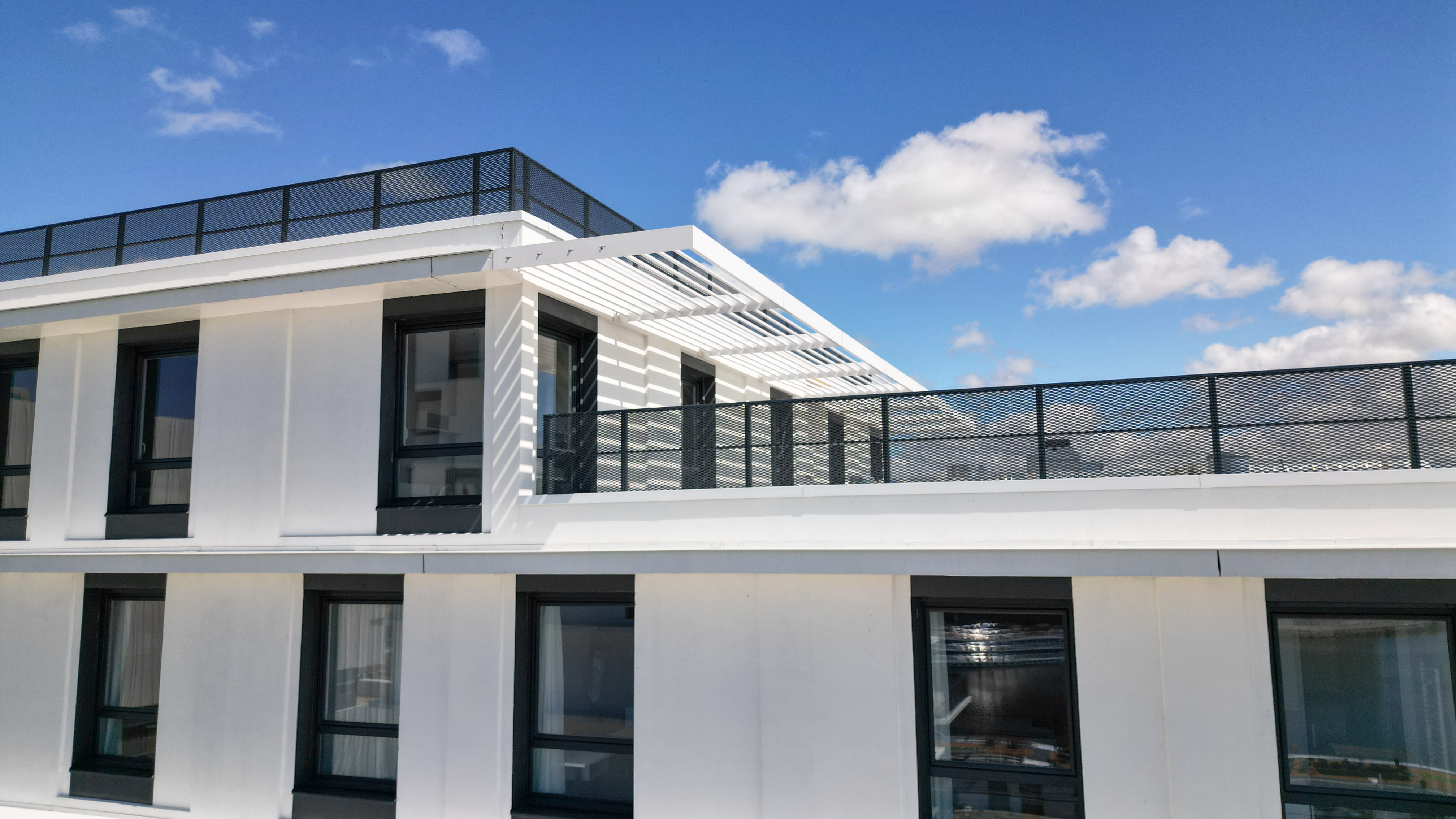 Les brise-soleil sont posés en fixation Intermédiaire, avec des modules préassemblés posés entre fixations murales. Ils sont faits avec des lames Cubic 100 en remplissage en couleur blanc.