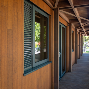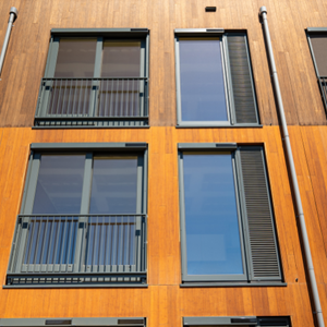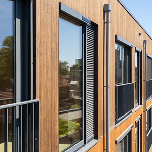 Door een DucoGrille Solid G30Z++P1 toevoerrooster te installeren, voldoen we aan de eisen voor inbraakwering (NEN 5096, RC2), regenwering en insectenwering. In de woningen op de begane grond worden de luiken voor ventilatieve koeling automatisch aangestuurd door het slimme Duco-regelsysteem. Daarvoor plaatsen we DucoGrille Close 105 elementen in de gevel.