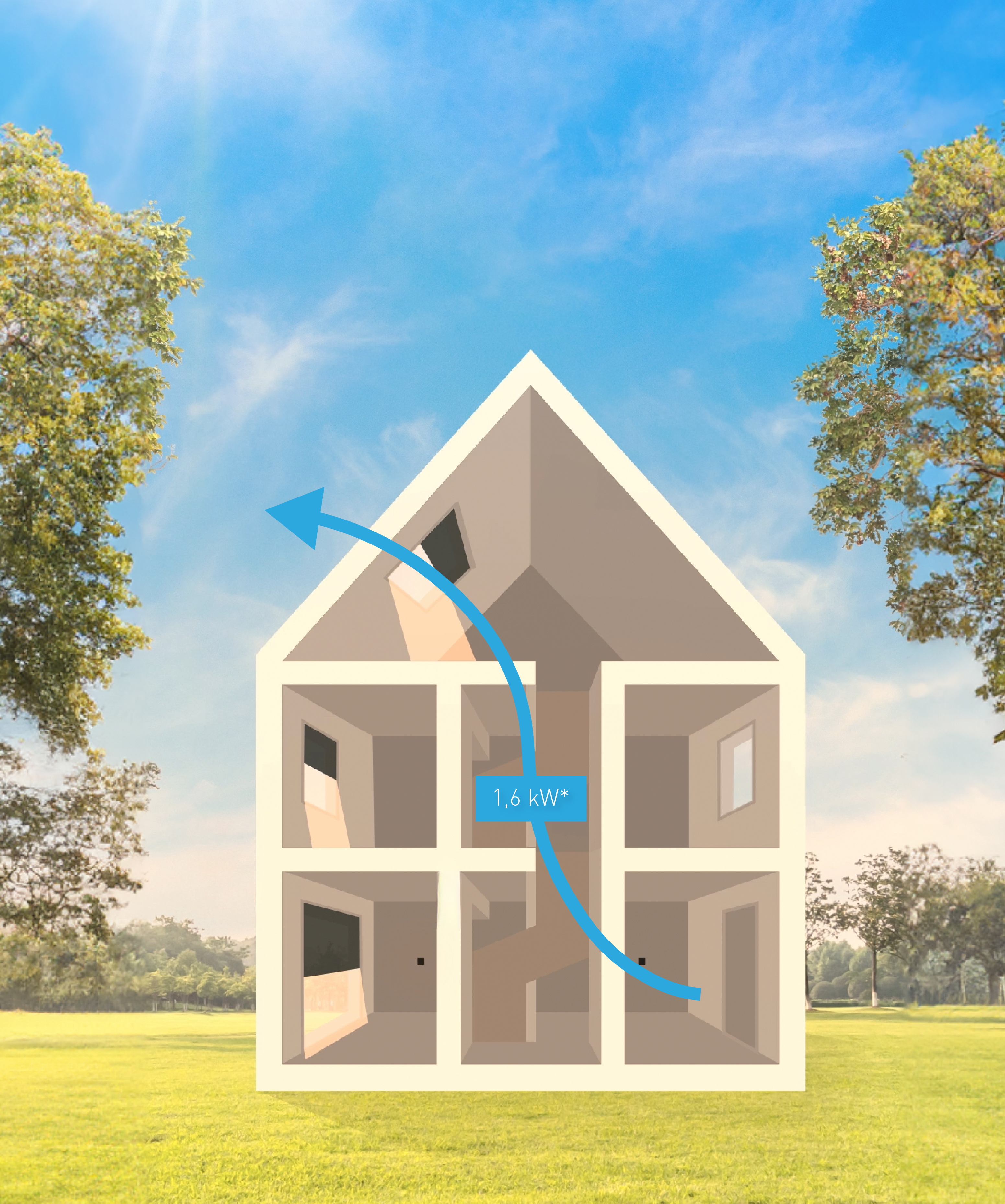 - 100 W door ventilatielucht (warme lucht van buiten naar binnen)