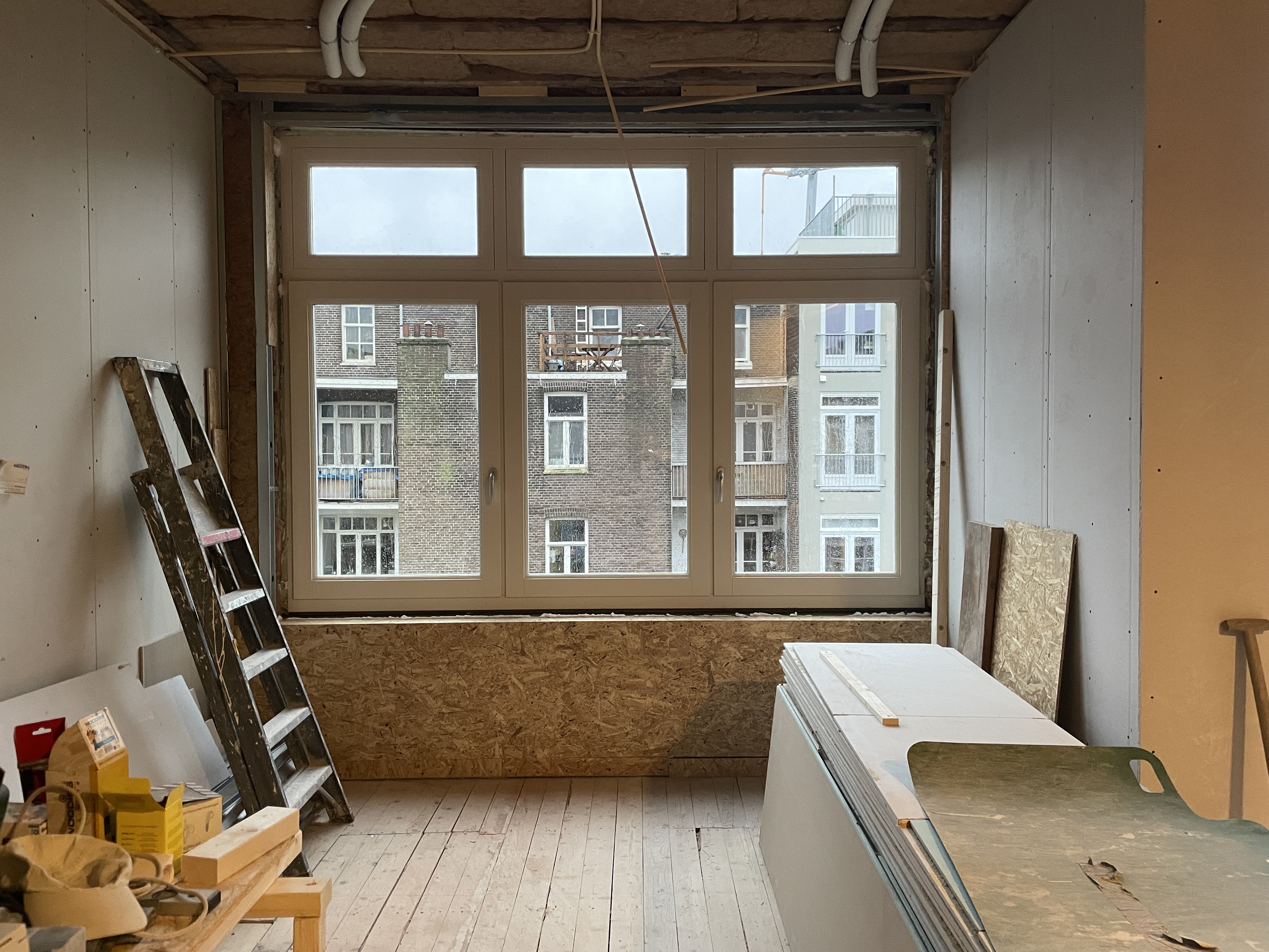 De kozijnen werden vervangen door origineel hardhouten exemplaren met HR++ glas. Het appartement zal worden verwarmd met lage-temperatuur-vloerverwarming, ingebed in houtvezelplaten voor maximale warmte-efficiëntie en geluidsreductie.