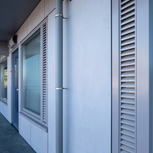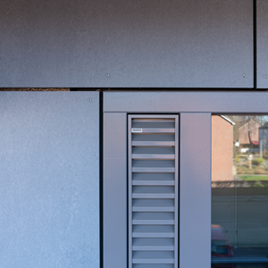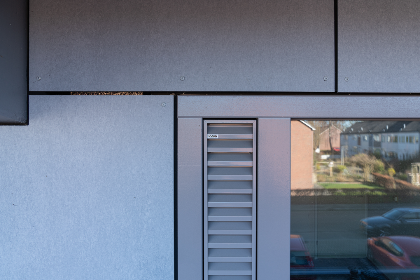 De architecturale zonwering DucoSlide gaat naadloos op in het moderne geheel en de houten lamellen geven het gevelbeeld een unieke toets. De onzichtbare bevestiging van de lamellen binnen het kader bieden een tweede esthetische meerwaarde. De houten accenten van de schuifpanelen komen in de groene omgeving volledig tot hun recht. Naast DucoSlide schuifpanelen werden ook lamellenroosters DucoGrille Solid M 30Z toegepast.