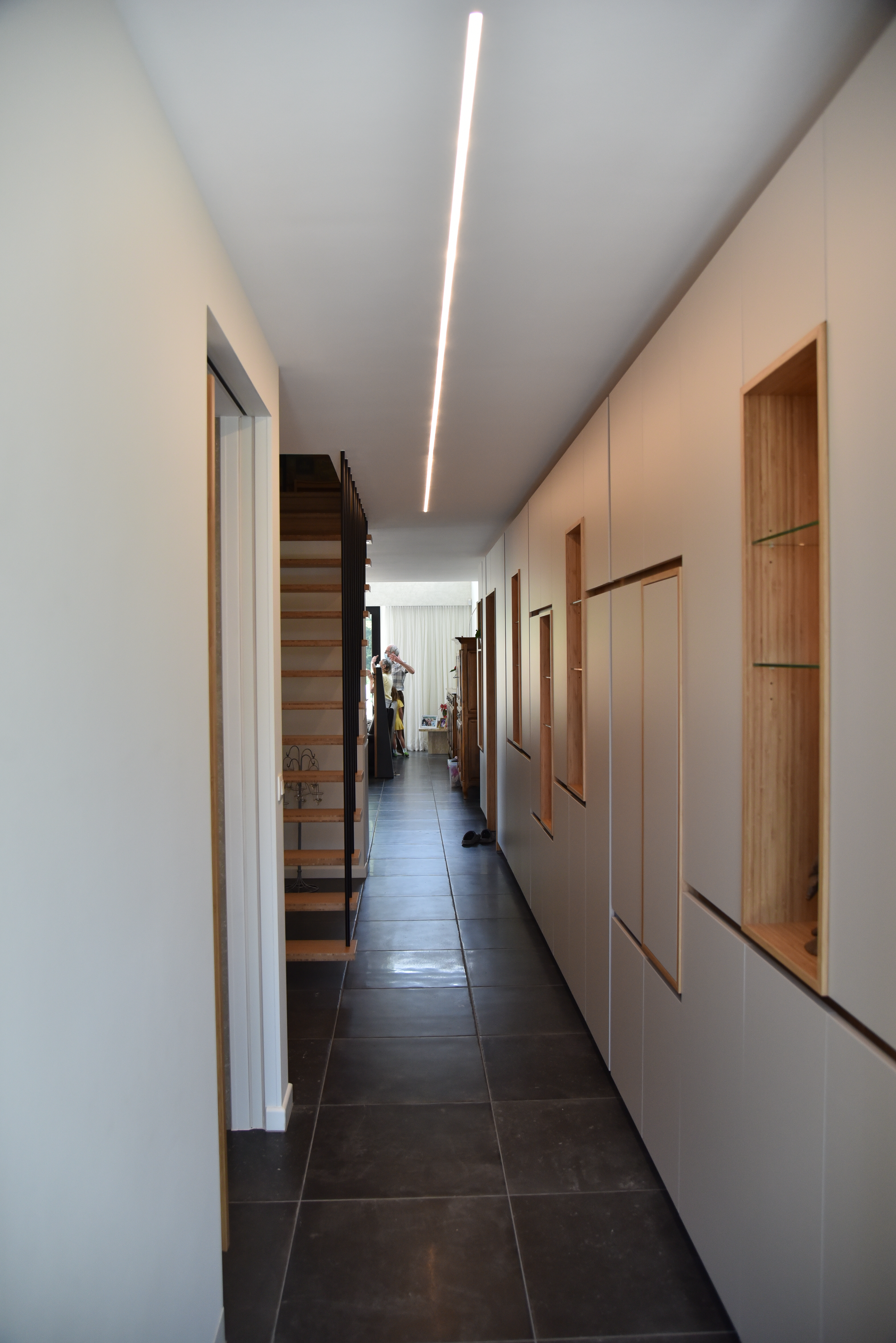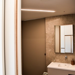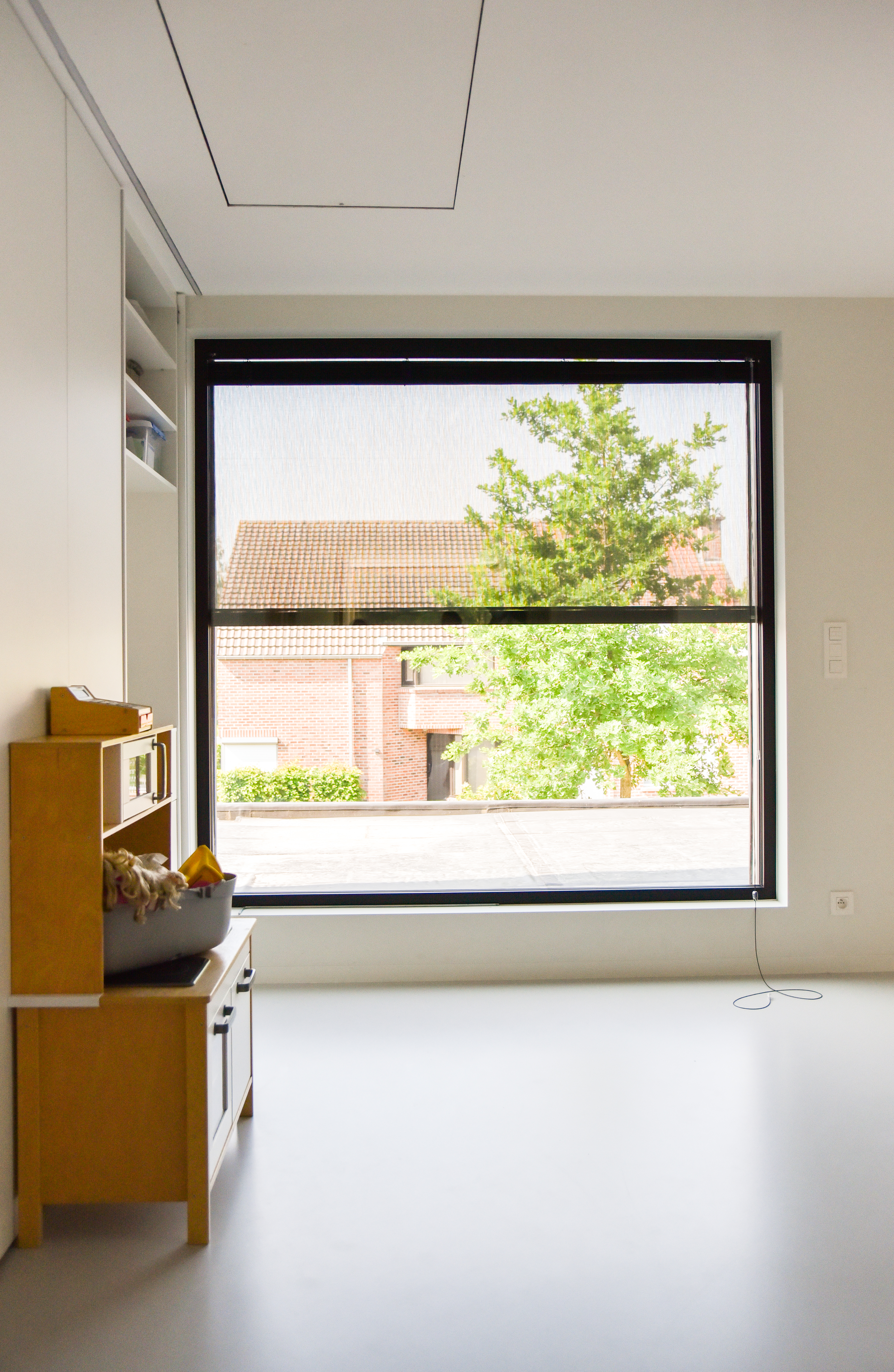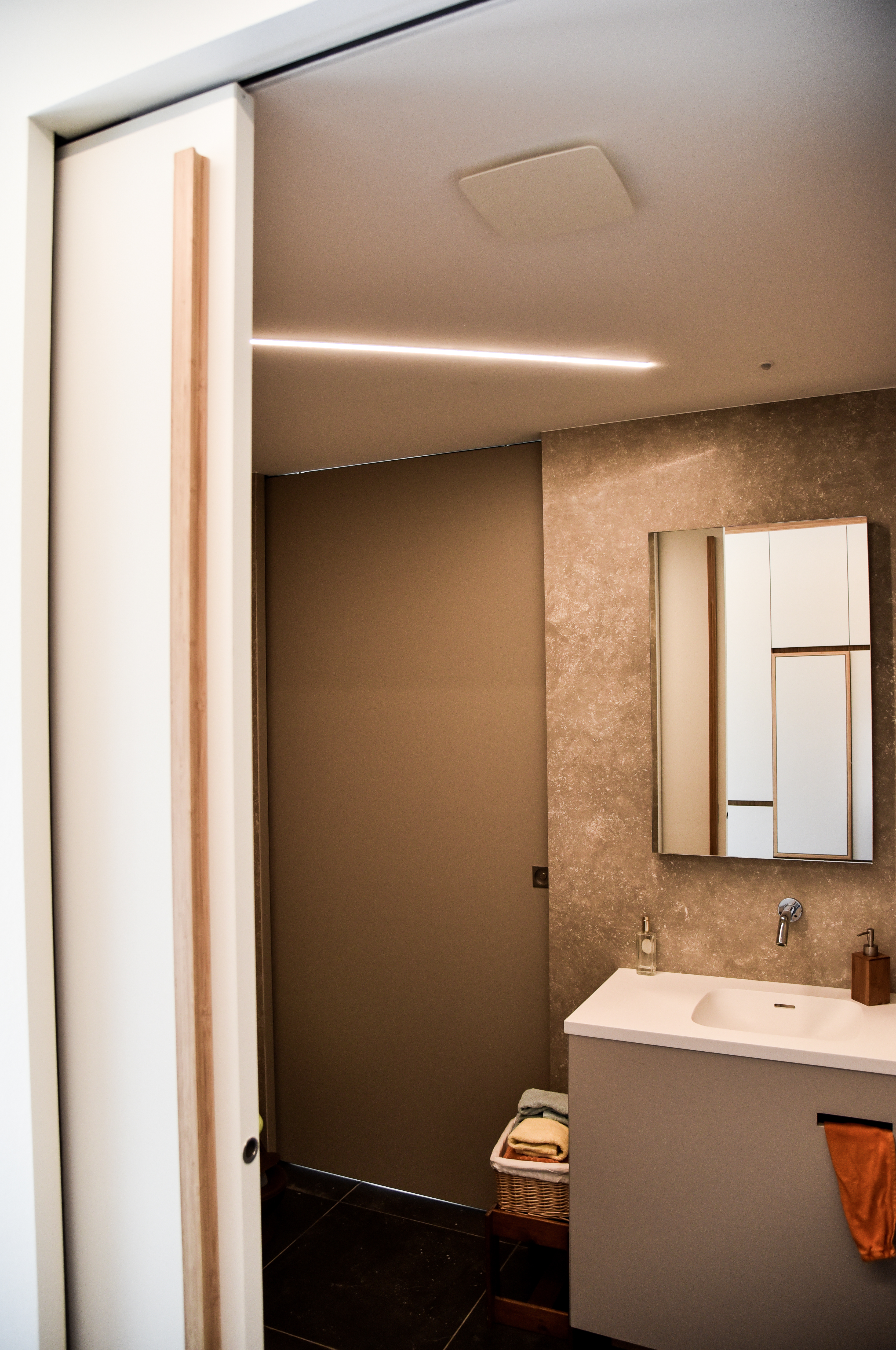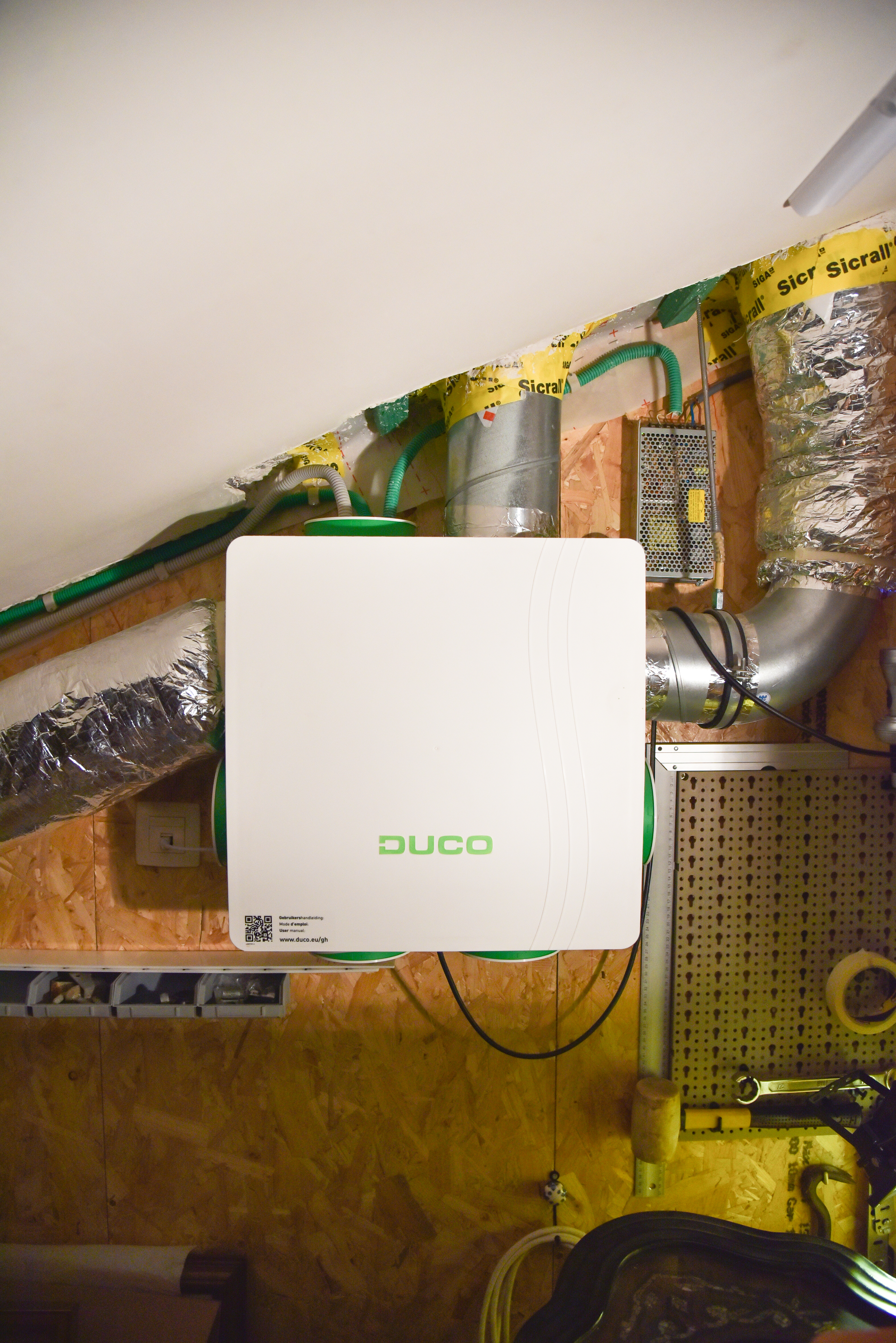 De keuze voor verwarming viel op vloerverwarming met een warmtepomp en geothermische bron. Hiermee kan dan meteen ook tijdens de warmere dagen van het jaar het gebouw goedkoop en duurzaam koel gehouden worden. Ook inzake ventilatie hadden de bewoners strenge eisen. “We wilden een gezonde, stille en tochtarme woonst”, zegt Pieter Maes. Hij kende DUCO en de ventilatie-oplossingen van het bedrijf al lang, en daarom twijfelde hij niet om met DUCO in zee te gaan voor de ventilatie. “Elke wooneenheid wordt apart geventileerd, met een vraaggestuurd C-systeem. We kozen voor de afvoer van de vochtige of vervuilde lucht voor de DucoBox Silent Connect. Toevoer van verse lucht in de leefruimtes gebeurt door de meest recente elektronische TronicVent raamroosters met goede akoestische demping. De ruimtes zijn voorzien van CO2-sensoren en -bedieningen. Vochtmeting in de badkamers gebeurt door boxsensoren die meten in het luchtkanaal, en in de toiletten wordt de ventilatie geregeld op basis van aanwezigheidsdetectie.”