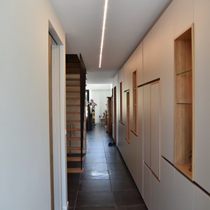 “Het resultaat is een kangoeroewoning die later officieel een zorgwoning kan worden”, zo licht men het project toe. “Het gebouw omvat grenzend aan beide wooneenheden een gemeenschappelijk gedeelte, voor beiden toegankelijk zonder elkaar te storen, met onder meer een koelcel, wasmachine en droogkast, stofzuiger en strijkplank, en opslagruimte. Verder is er ook een gemeenschappelijke carport en tuin. Daarnaast is er desondanks veel aandacht voor individualiteit: elke wooneenheid kan volledig autonoom overleven, en dat kan interessant zijn wanneer één van de huidige gezinnen zou wegvallen. Beide wooneenheden zijn akoestisch volledig van elkaar gescheiden, met een volledig gesloten muur en branddeur ertussen maar wel met een aparte voordeur. Ook de terrassen en een gedeelte van de tuin hebben een soort scheidingsbarrière die inkijk vermijdt.” Duurzaamheid was voor de gezinnen Maes en Naudts een vanzelfsprekendheid, weliswaar zonder de kostprijs uit het oog te verliezen. De wooneenheden elk apart haalden de BEN-norm, dankzij een E-peil van 12 en 14 (en S28 en S29).