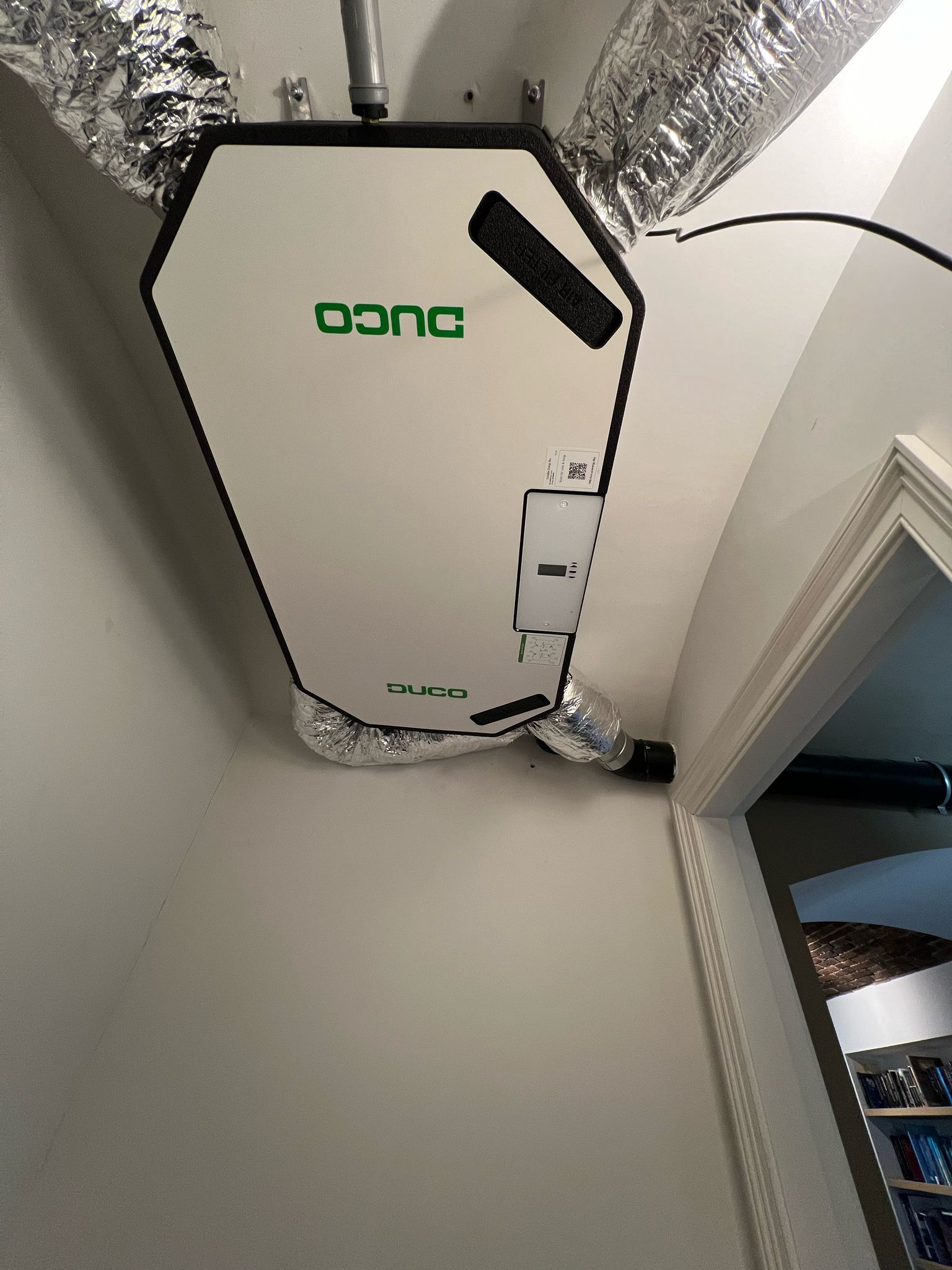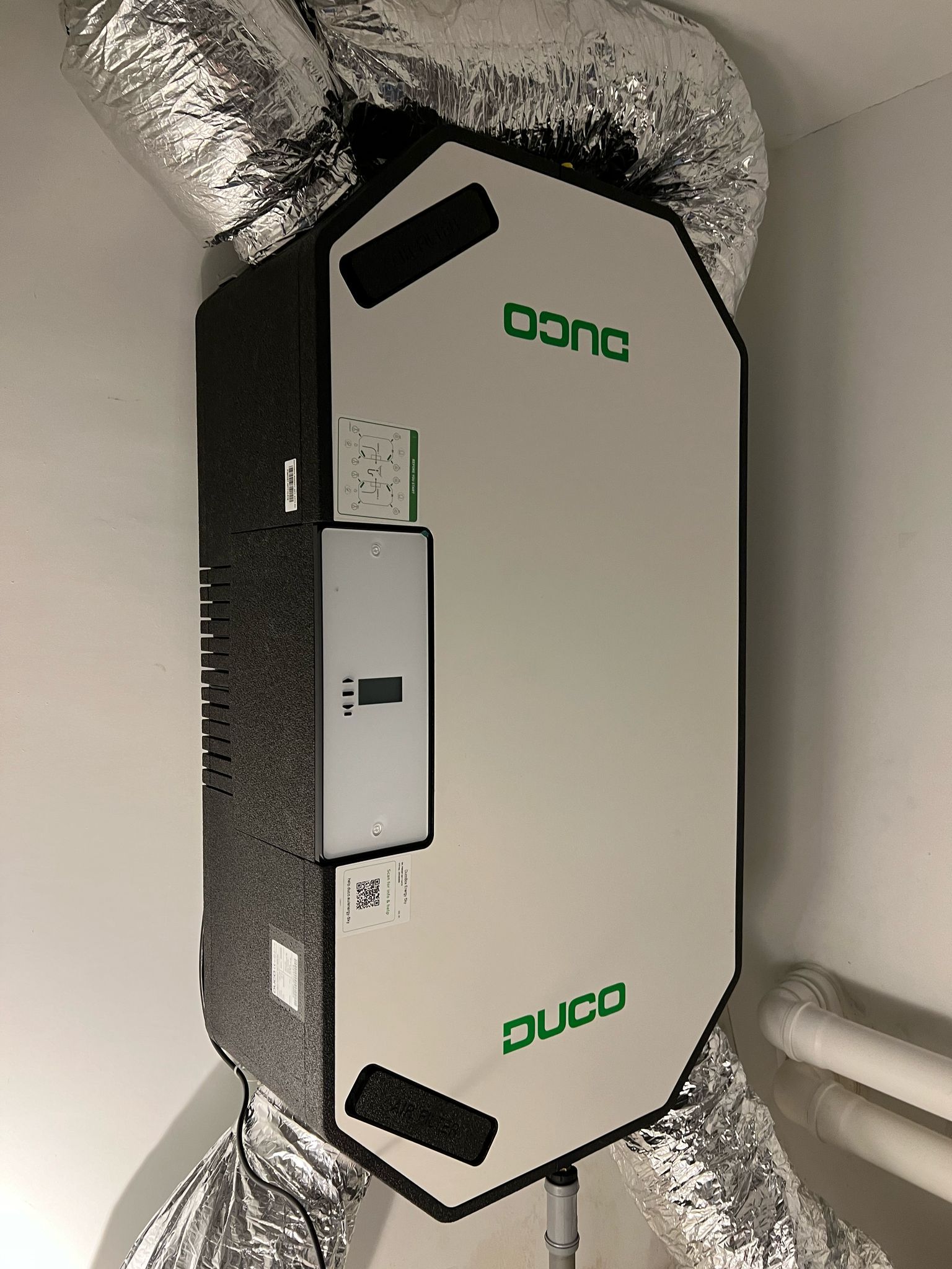 De stap naar een ventilatiesysteem met warmteterugwinning lag dus voor de hand. De keuze viel op de DucoBox Energy Sky: compact, krachtig en perfect voor montage aan het plafond. “Aan de muur hadden we simpelweg geen plek, dus dit was dé oplossing.”