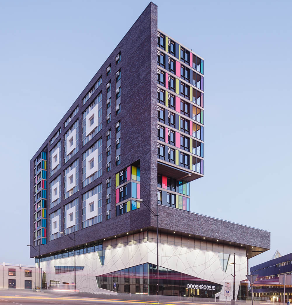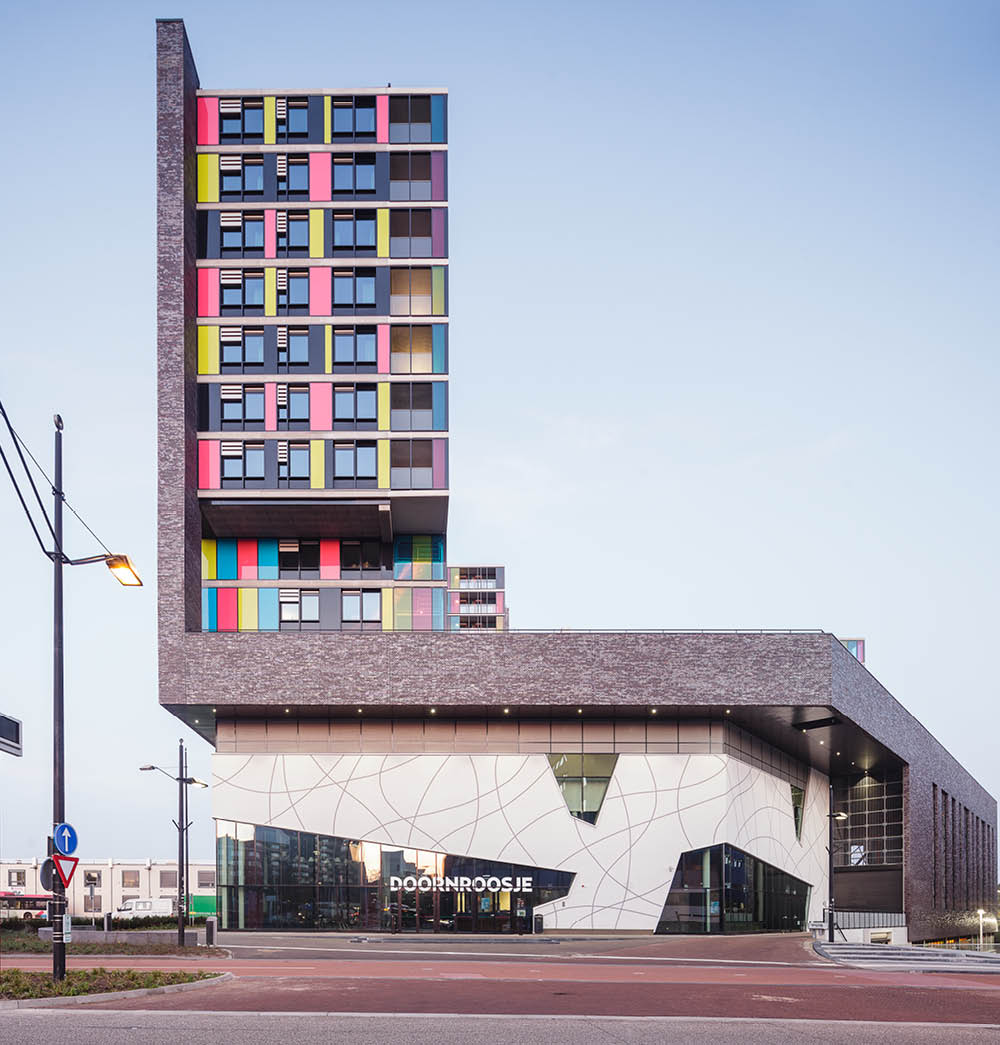 Doornroosje is hét poppodium van Nijmegen en omstreken. De nieuwbouw aan het Centraal Station omvat twee zalen, goed voor een capaciteit van 1.500 bezoekers, maar biedt daarnaast onderdak aan 350 studentenappartementen en een fietsenstalling met 4000 plaatsen. Geluid was een belangrijk element bij het ontwerp. DUCO leverde met de implementatie van geluiddempende ventilatieroosters -type DucoMax ‘ZR’- ook haar bijdrage.