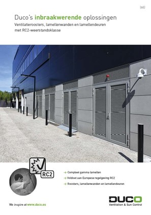 DUCO ontwikkelde een breed en vernieuwend gamma van lamellenwandsystemen: waterwerend, met hoge ventilatiecapaciteit, geluiddempend... Voortaan kan elk type lamellenwand inbraakwerend* worden uitgevoerd, door deze te voorzien van DUCO’s gepatenteerde oplossing. Hierdoor voldoet de lamellenwand aan RC2‑weerstandsklasse volgens de Europese norm. Deze compacte oplossing zorgt er bovendien voor dat de inbouwdiepte van de RC2 lamellenwand gelijk blijft in vergelijking met de standaard lamellenwanden, wat een uniform gevelbeeld garandeert. Bovendien zijn de lamellenwanden combineerbaar met DucoDoor lamellendeuren die ook inbraakwerend uitgevoerd kunnen worden.