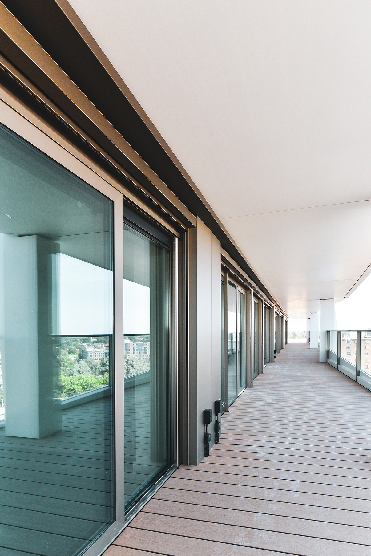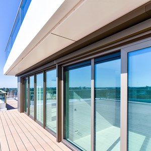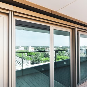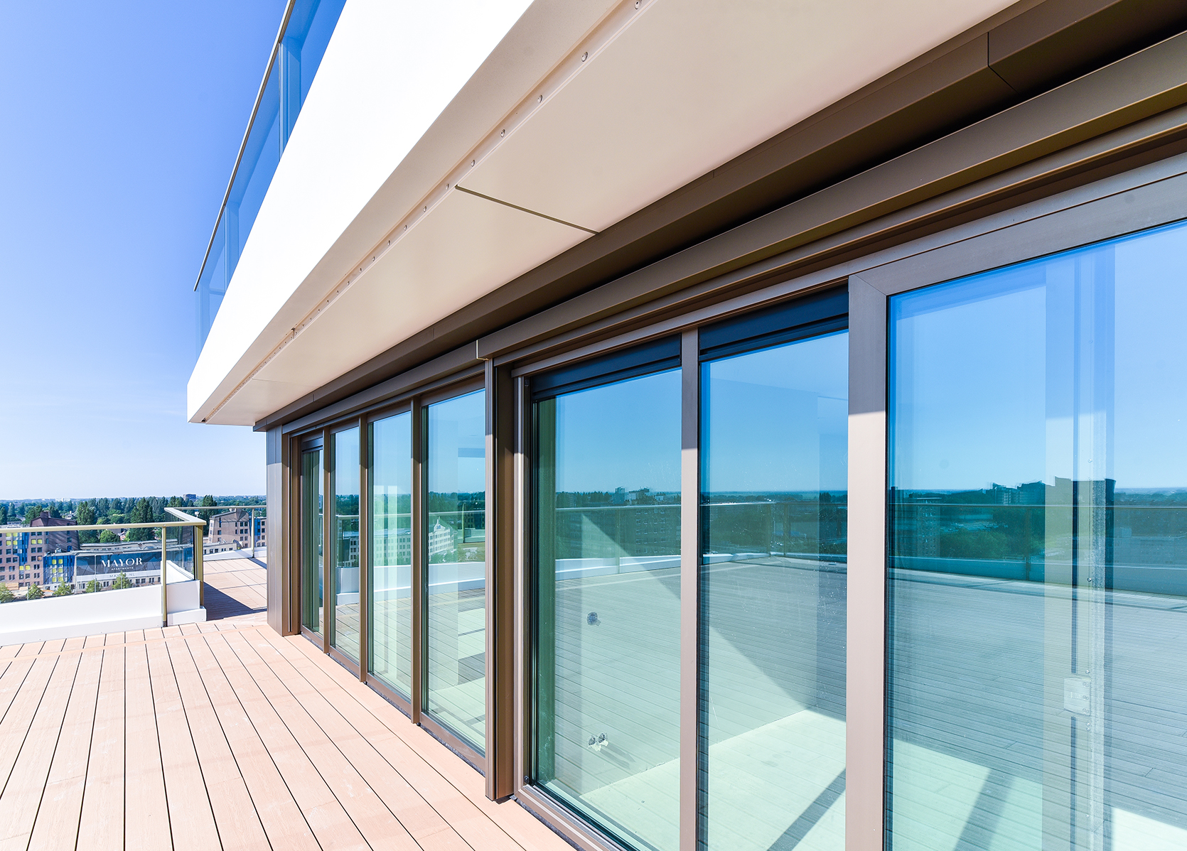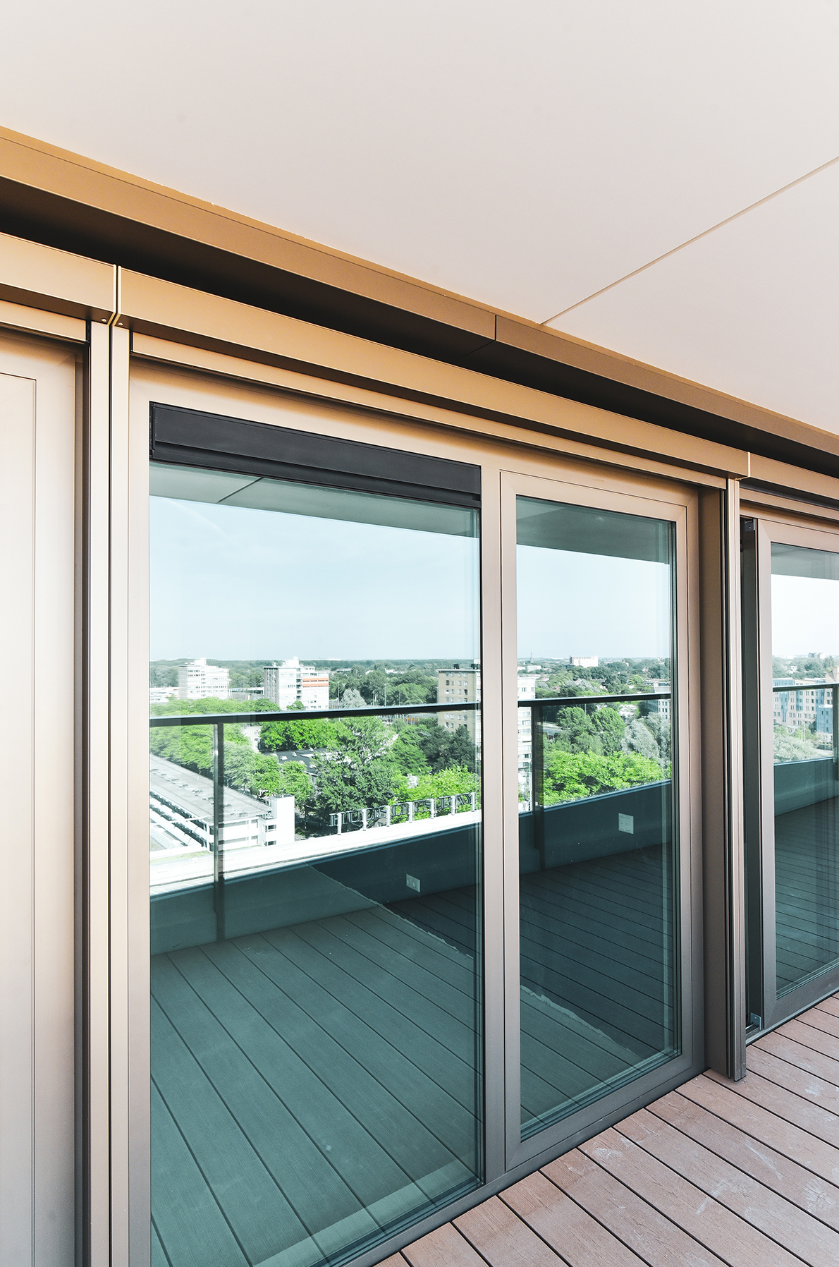 “De uitdaging bestond erin om het ventilatierooster discreet te integreren in de triple-beglazing van de schuifpuien”, gaat van der Wal verder. “Voor woongebieden langs drukke invalswegen, waar geluidsoverlast een rol speelt, vormen suskasten de perfecte oplossing. Ze voorzien de ruimte continu van goed geventileerde lucht en dat zonder geluidsoverlast (demping tot 35dB). Voor Up Mountain bedachten we een custom-made oplossing met elektronisch gestuurde susroosters. Het rooster TronicMiniMax werd voor dit project op het glas geplaatst, waardoor hij zich perfect leent voor de schuifpuien. De actief sluitende aluminium klep voorkomt bovendien fluittonen bij over- of onderdruk in hoogbouw. Met dit susrooster ervaren de bewoners binnenshuis zowel een prettige, natuurlijke ventilatie als een aangename rust.”
