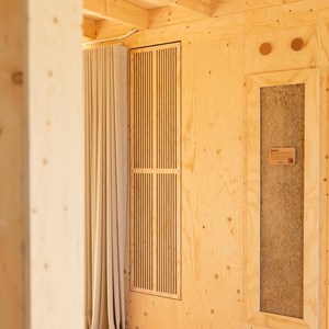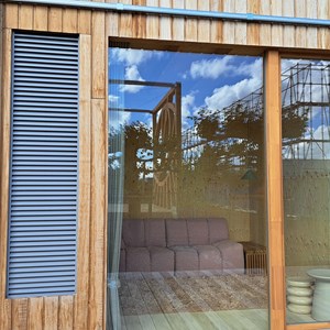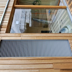 Een van de meest innovatieve elementen in de ventilatiestrategie van de SMÛK-woning is Duco Natural Cooling, een slimme, natuurlijke manier van koelen zonder mechanische airconditioning. DUCO leverde hiervoor de DucoGrille Close 105, een automatisch gestuurd ventilatieluik dat ervoor zorgt dat er op natuurlijke wijze verse buitenlucht de woning binnenkomt. Dit luik opent en sluit automatisch op basis van temperatuur en luchtkwaliteit, waardoor de woning op warme dagen op een energiezuinige manier gekoeld wordt.