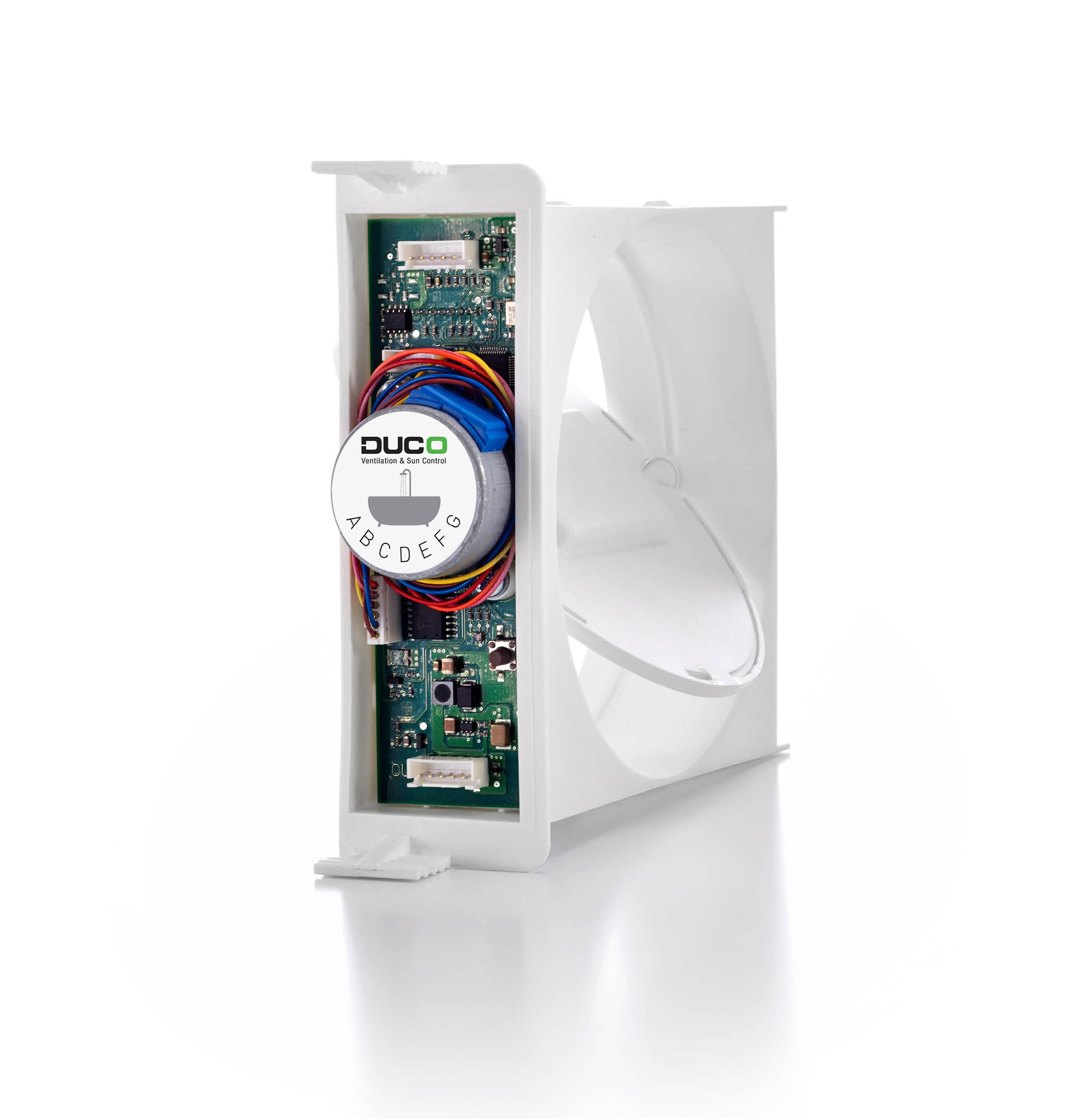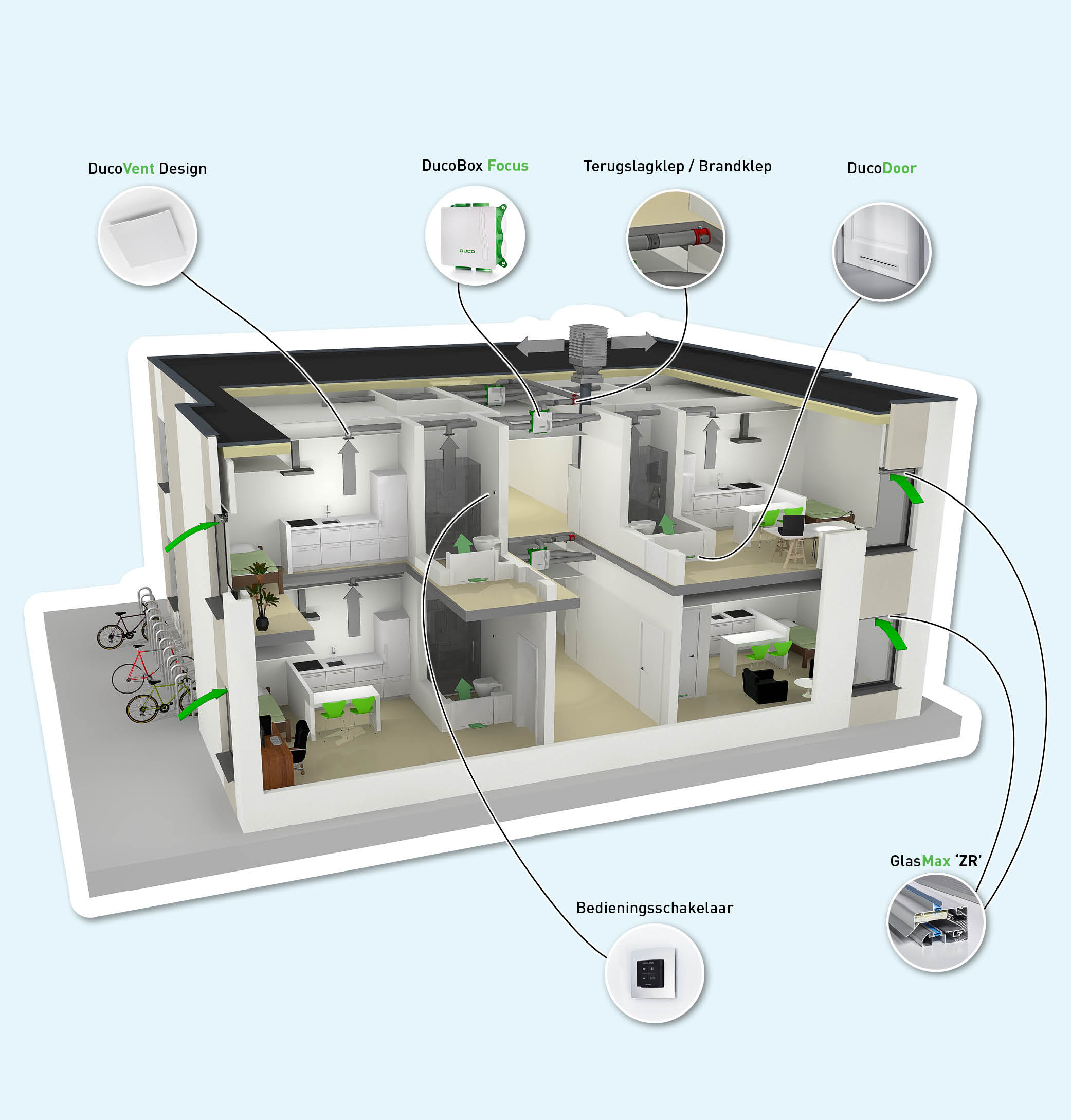 Het Duco Comfort Plus System biedt een natuurlijke toevoer dankzij de zelfregelende roosters in de gevel. De vraaggestuurde mechanische zonale afvoer is voor rekening van de DucoBox Focus en werkt klepgestuurd op basis van CO2-metingen in de keuken en vochtmetingen in de badkamer. Een bedieningsschakelaar geeft de gebruiker steeds de vrijheid om de ventilatie volledig naar eigen wens aan te sturen.