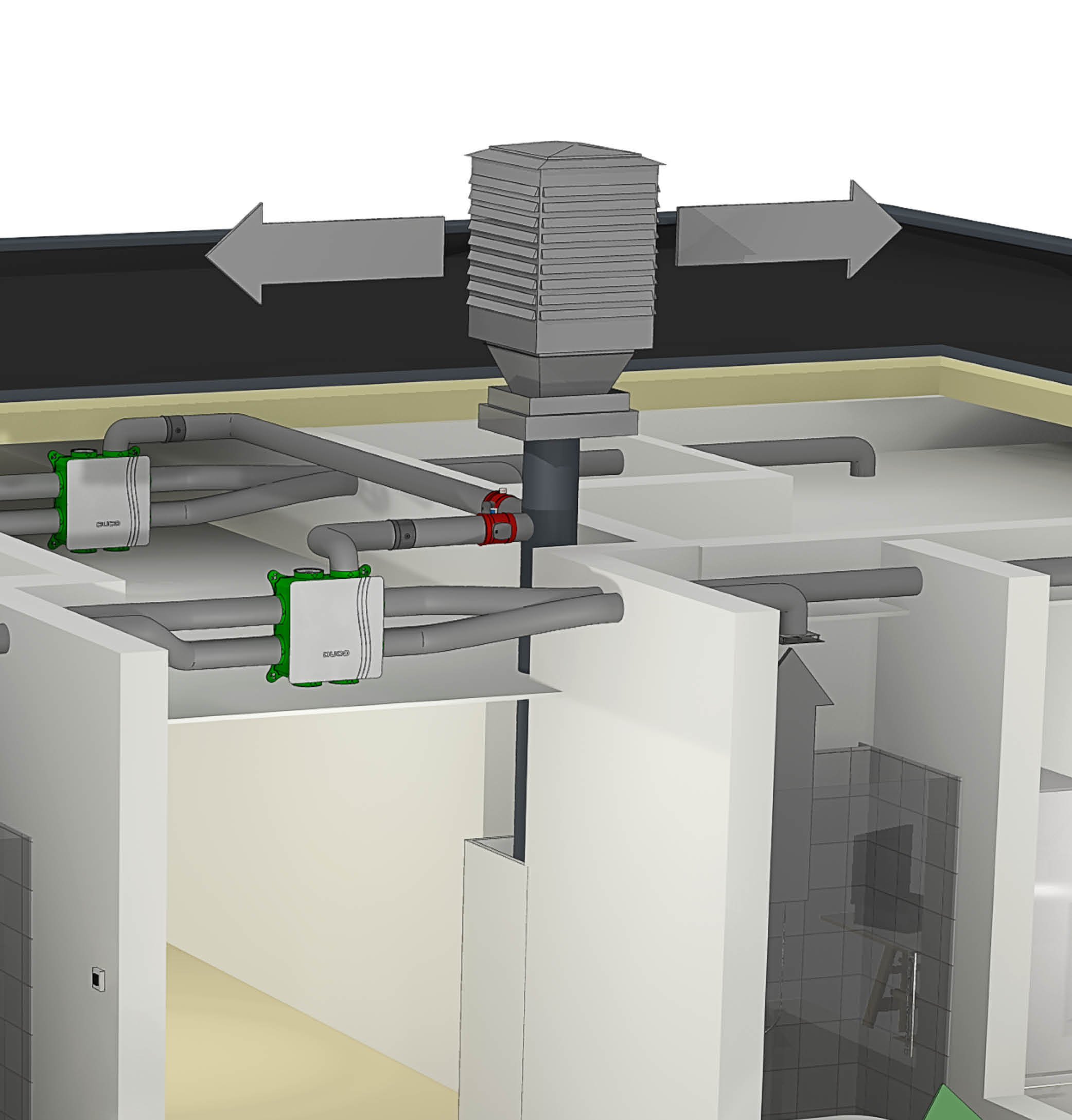 Het is bovendien mogelijk om twee à drie studio’s op één en dezelfde DucoBox Focus aan te sluiten. Zo kan er niet alleen op het aantal afvoerventilatoren en op de montagetijd bespaard worden, maar ook op het aantal kanalen naar de centrale afvoerschacht en bijgevolg ook eventueel op de toe te passen terugslag- of brandkleppen.