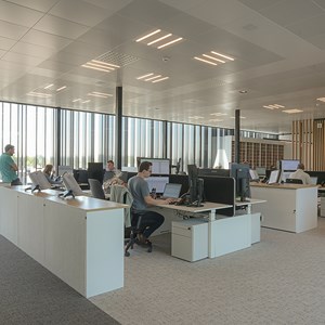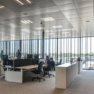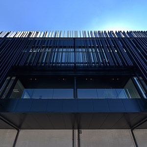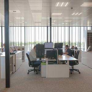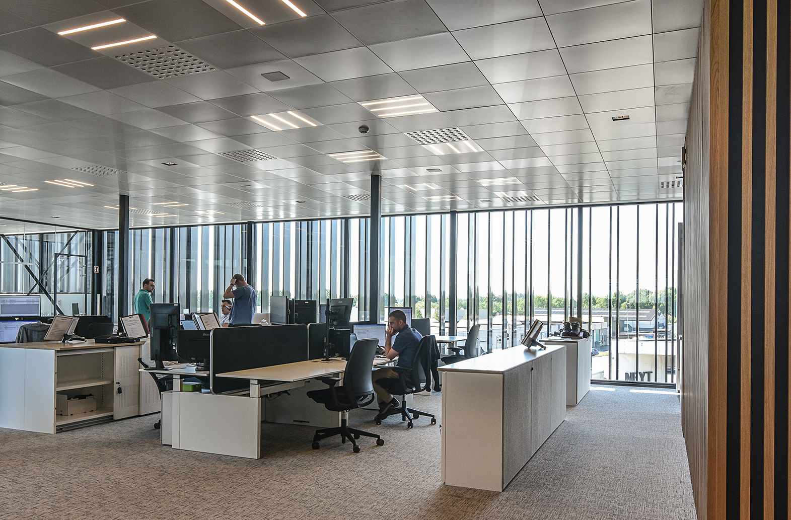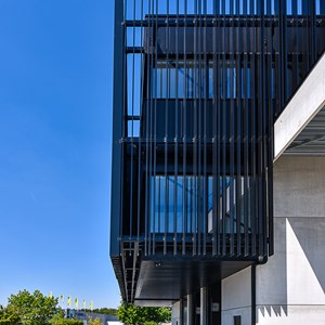 ‘De structurele lamellen zorgen niet alleen voor een efficiënte afscherming van de zonnestralen, ze garanderen ook een daling van de gemiddelde temperatuur binnenshuis tot 12% in de strijd tegen oververhitting’, vertelt Hendrik Dejonghe, marketing manager bij DUCO. ‘De plaatsing van de lamellen was een technisch hoogstandje. De kenmerkende lamellen werden ter plaatse in de draagconstructie verticaal gemonteerd. Tussen de lamellen en de muur zijn roosters voorzien. Zo kunnen de grote ramen gepoetst worden. De lamellen moesten perfect in het vlak zitten. Om dat waar te maken, plaatste de aannemer ze één per één. Een precisiewerk dat veel tijd in beslag nam, maar het resultaat mag er zeker zijn’, aldus een tevreden Dejonghe.