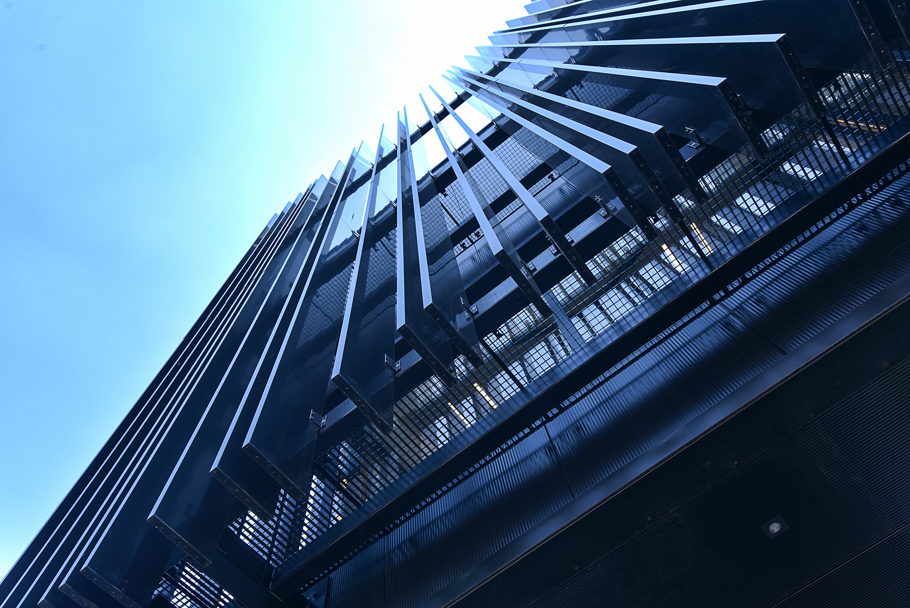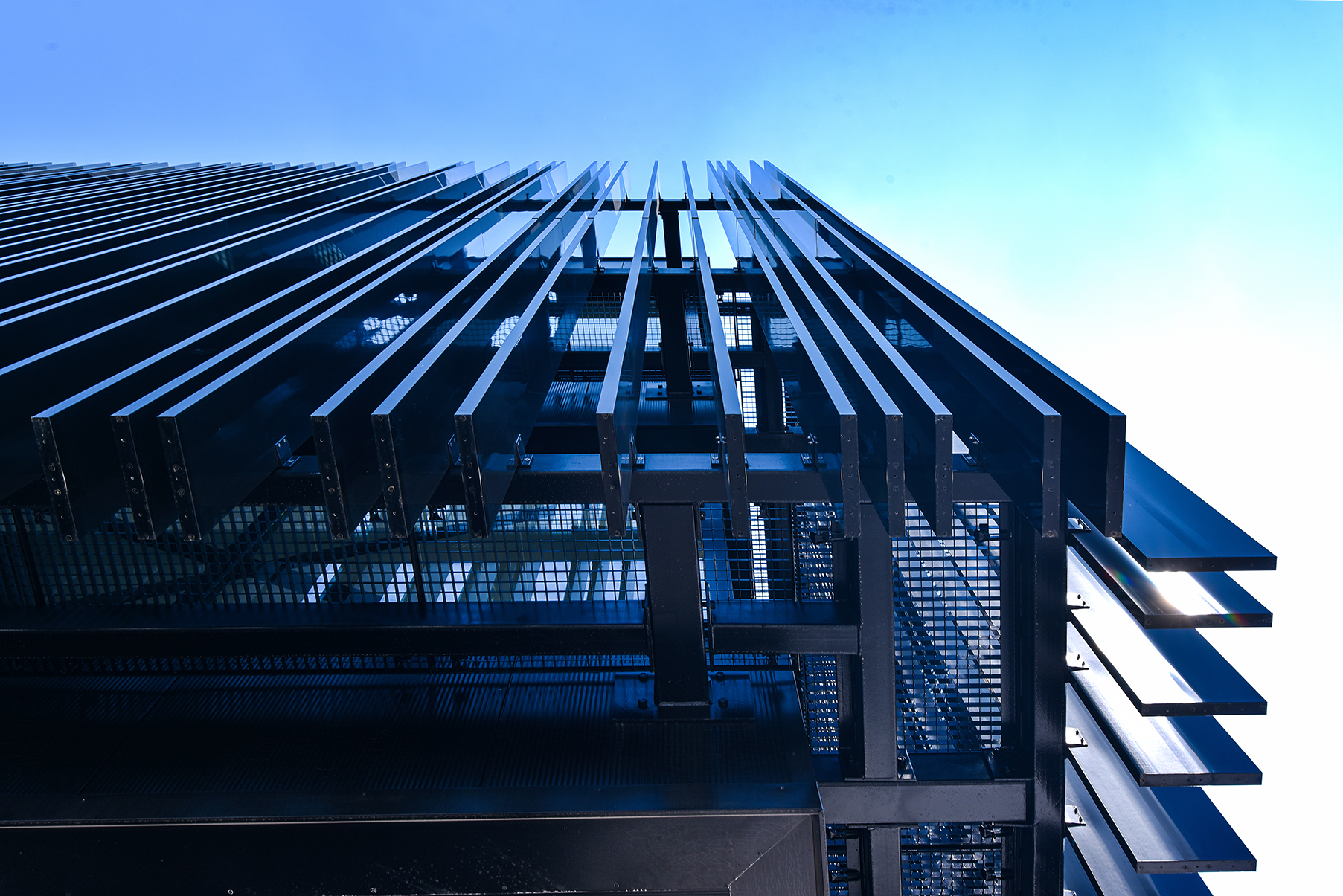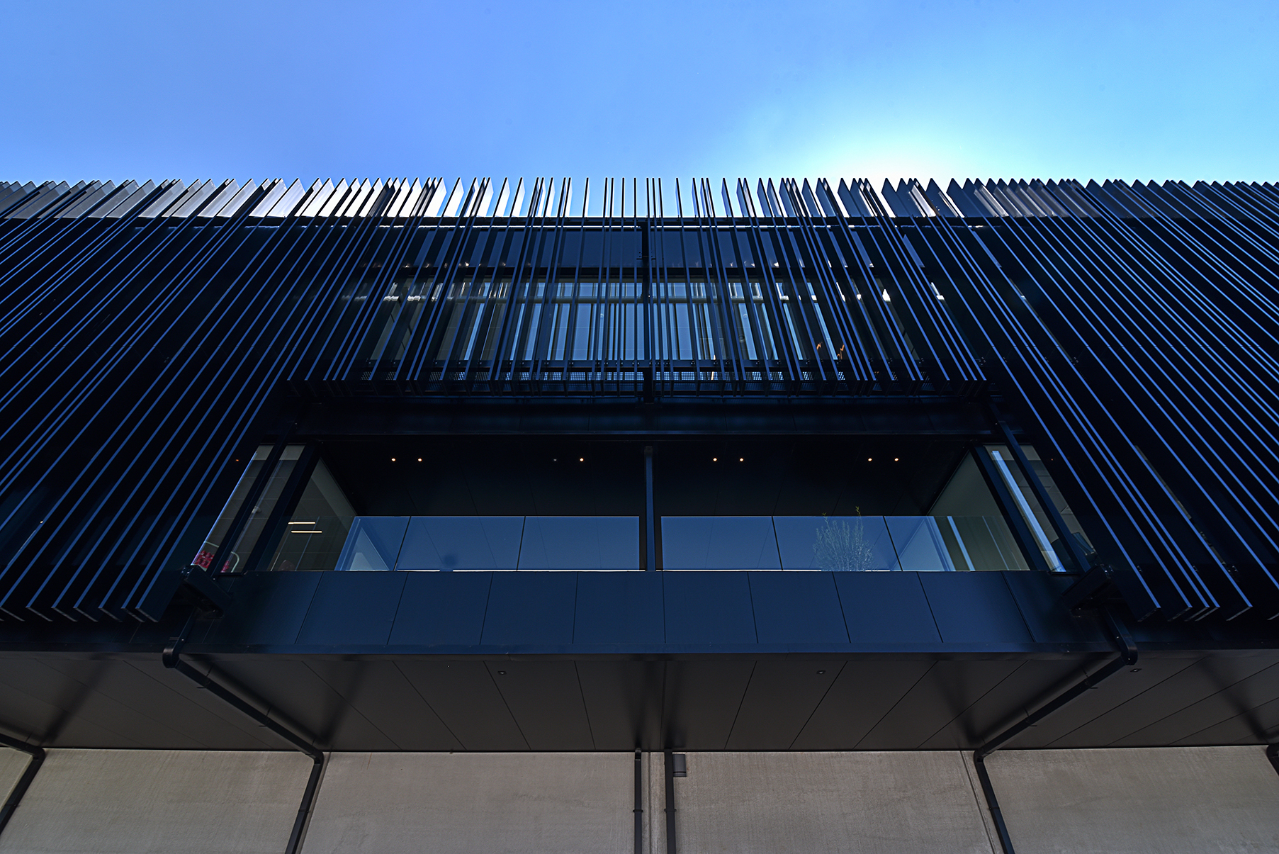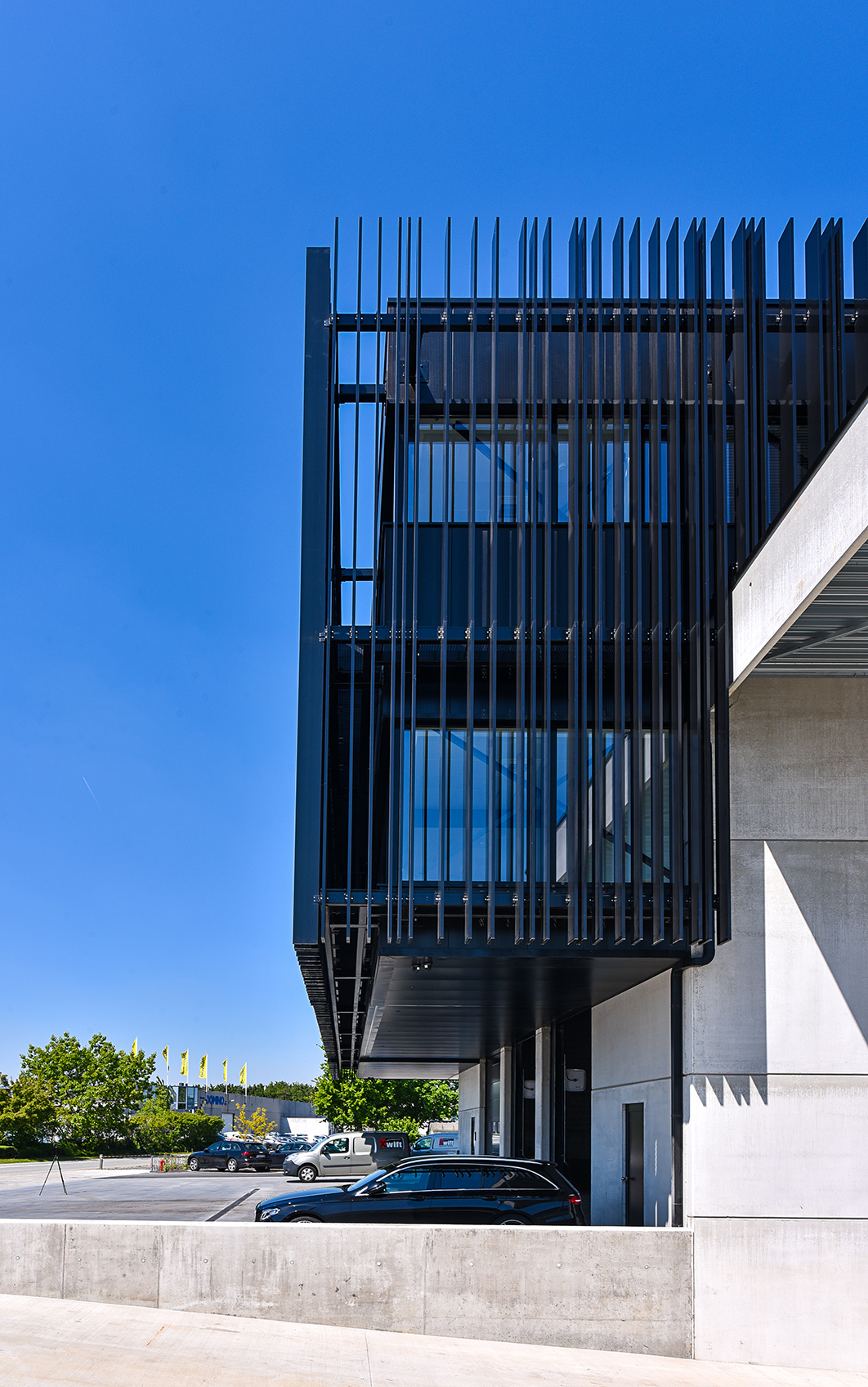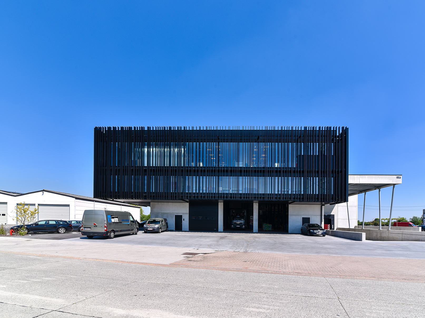 Alle materialen moesten een zwarte kleur hebben: het staal, de ramen, de lamellen, de sandwichpanelen, de poorten, … Cosman licht toe: ‘De gevel van het gebouw is bovenaan aangekleed met zwarte rechthoekige DucoSun Cubic lamellen. Die aluminium lamellen hebben een dubbele functie. Ze dienen enerzijds als zonwering en vermijden inkijk. Anderzijds zorgen ze voor een speelse dynamiek en geven ze het gebouw een bijzondere uitstraling.’