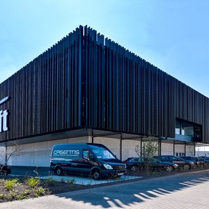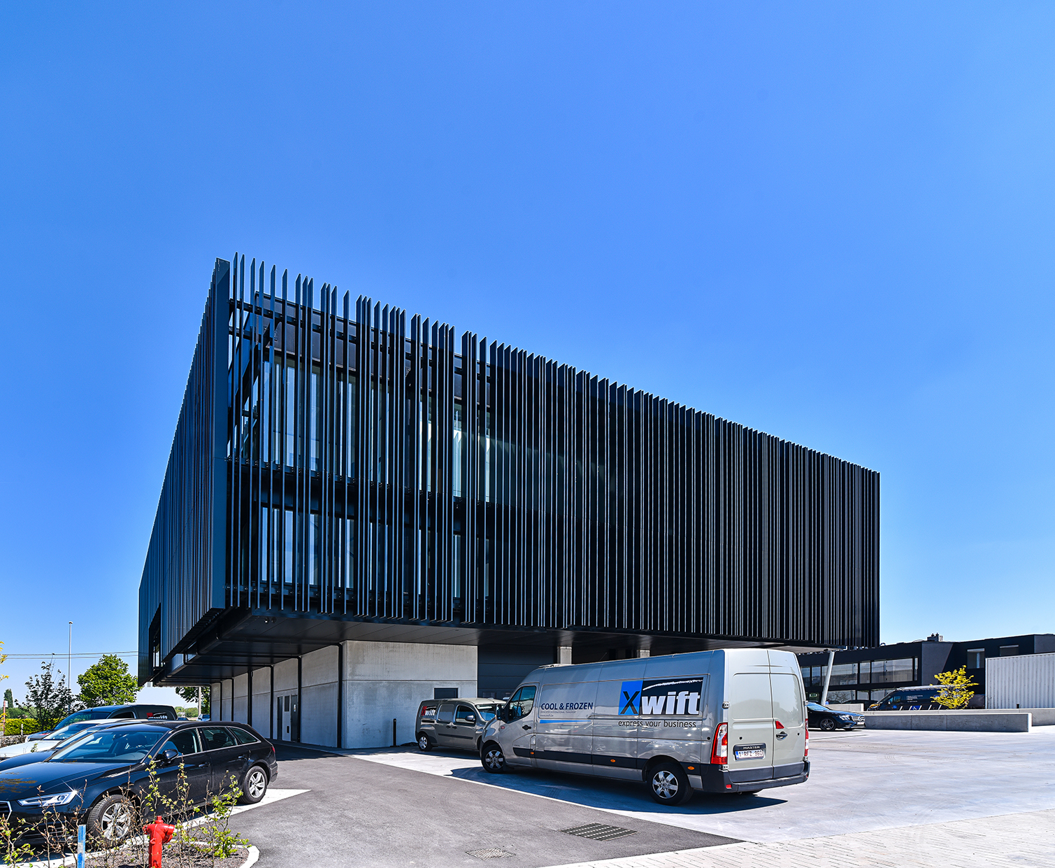Wat het gloednieuwe bedrijfsgebouw van transportbedrijf Xwift in Nazareth zo in het oog doet springen? Uiteraard de lichte constructie in staalbouw, maar zeker ook de unieke gevel, die integraal bestaat uit zwarte DucoSun Cubic lamellen. Het variabele ritme van de lamellen zorgt voor een boeiend tafereel, dat er vanuit elk standpunt anders uitziet. Bovendien helpt de architecturale zonwering om het binnenklimaat aangenaam te houden in de strijd tegen oververhitting.