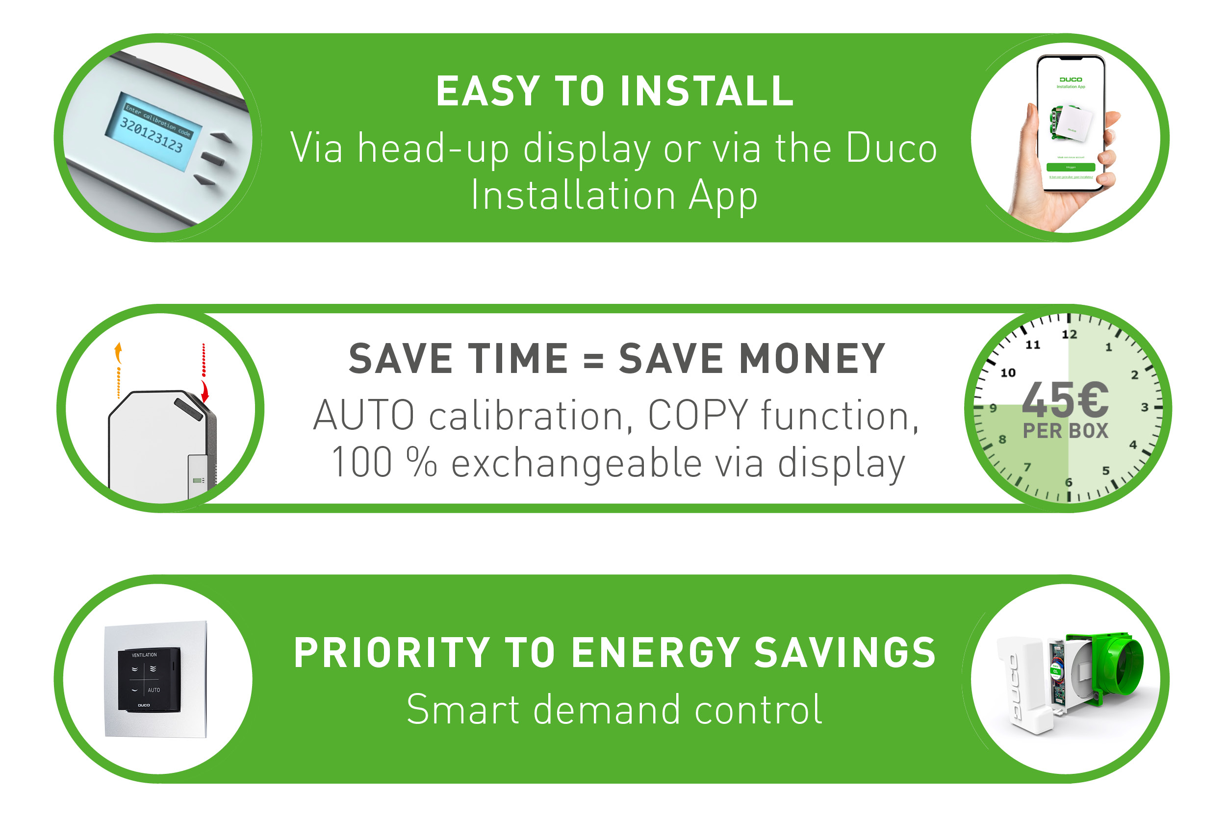The DucoBox Energy Sky automatically adjusts the ventilation to the actual need using the optional integrated 2-zone control. You thus automatically control the ventilation system based on CO2 and humidity, allowing you to ventilate even more efficiently.